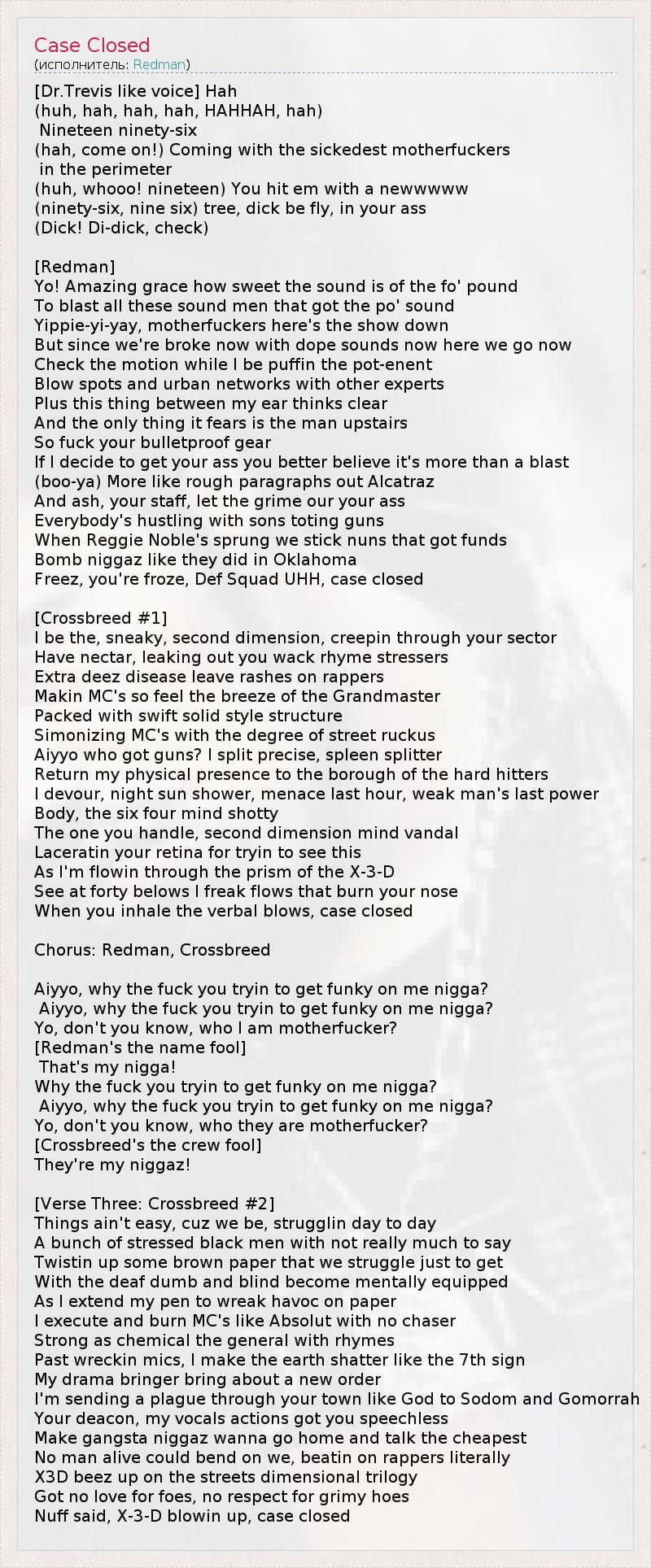 [Dr.Trevis like voice] Hah (huh, hah, hah, hah, HAHHAH, hah) Nineteen ninety-six (hah, come on!) Coming with the sickedest motherfuckers in the perimeter (huh, whooo! nineteen) You hit em with a newwwww (ninety-six, nine six) tree, dick be fly, in your ass (Dick! Di-dick, check) [Redman] Yo! Amazing grace how sweet the sound is of the fo' pound To blast all these sound men that got the po' sound Yippie-yi-yay, motherfuckers here's the show down But since we're broke now with dope sounds now here we go now Check the motion while I be puffin the pot-enent Blow spots and urban networks with other experts Plus this thing between my ear thinks clear And the only thing it fears is the man upstairs So fuck your bulletproof gear If I decide to get your ass you better believe it's more than a blast (boo-ya) More like rough paragraphs out Alcatraz And ash, your staff, let the grime our your ass Everybody's hustling with sons toting guns When Reggie Noble's sprung we stick nuns that got funds Bomb niggaz like they did in Oklahoma Freez, you're froze, Def Squad UHH, case closed [Crossbreed #1] I be the, sneaky, second dimension, creepin through your sector Have nectar, leaking out you wack rhyme stressers Extra deez disease leave rashes on rappers Makin MC's so feel the breeze of the Grandmaster Packed with swift solid style structure Simonizing MC's with the degree of street ruckus Aiyyo who got guns? I split precise, spleen splitter Return my physical presence to the borough of the hard hitters I devour, night sun shower, menace last hour, weak man's last power Body, the six four mind shotty The one you handle, second dimension mind vandal Laceratin your retina for tryin to see this As I'm flowin through the prism of the X-3-D See at forty belows I freak flows that burn your nose When you inhale the verbal blows, case closed Chorus: Redman, Crossbreed Aiyyo, why the fuck you tryin to get funky on me nigga? Aiyyo, why the fuck you tryin to get funky on me nigga? Yo, don't you know, who I am motherfucker? [Redman's the name fool] That's my nigga! Why the fuck you tryin to get funky on me nigga? Aiyyo, why the fuck you tryin to get funky on me nigga? Yo, don't you know, who they are motherfucker? [Crossbreed's the crew fool] They're my niggaz! [Verse Three: Crossbreed #2] Things ain't easy, cuz we be, strugglin day to day A bunch of stressed black men with not really much to say Twistin up some brown paper that we struggle just to get With the deaf dumb and blind become mentally equipped As I extend my pen to wreak havoc on paper I execute and burn MC's like Absolut with no chaser Strong as chemical the general with rhymes Past wreckin mics, I make the earth shatter like the 7th sign My drama bringer bring about a new order I'm sending a plague through your town like God to Sodom and Gomorrah Your deacon, my vocals actions got you speechless Make gangsta niggaz wanna go home and talk the cheapest No man alive could bend on we, beatin on rappers literally X3D beez up on the streets dimensional trilogy Got no love for foes, no respect for grimy hoes Nuff said, X-3-D blowin up, case closed