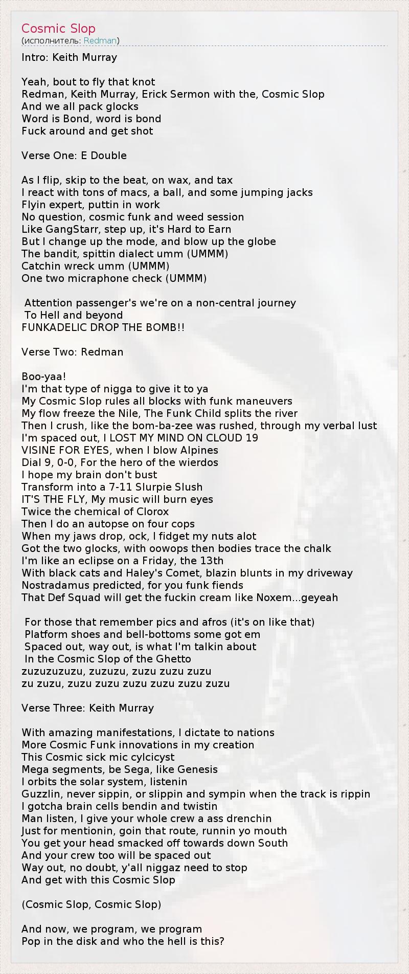 Intro: Keith Murray Yeah, bout to fly that knot Redman, Keith Murray, Erick Sermon with the, Cosmic Slop And we all pack glocks Word is Bond, word is bond Fuck around and get shot Verse One: E Double As I flip, skip to the beat, on wax, and tax I react with tons of macs, a ball, and some jumping jacks Flyin expert, puttin in work No question, cosmic funk and weed session Like GangStarr, step up, it's Hard to Earn But I change up the mode, and blow up the globe The bandit, spittin dialect umm (UMMM) Catchin wreck umm (UMMM) One two micraphone check (UMMM) Attention passenger's we're on a non-central journey To Hell and beyond FUNKADELIC DROP THE BOMB!! Verse Two: Redman Boo-yaa! I'm that type of nigga to give it to ya My Cosmic Slop rules all blocks with funk maneuvers My flow freeze the Nile, The Funk Child splits the river Then I crush, like the bom-ba-zee was rushed, through my verbal lust I'm spaced out, I LOST MY MIND ON CLOUD 19 VISINE FOR EYES, when I blow Alpines Dial 9, 0-0, For the hero of the wierdos I hope my brain don't bust Transform into a 7-11 Slurpie Slush IT'S THE FLY, My music will burn eyes Twice the chemical of Clorox Then I do an autopse on four cops When my jaws drop, ock, I fidget my nuts alot Got the two glocks, with oowops then bodies trace the chalk I'm like an eclipse on a Friday, the 13th With black cats and Haley's Comet, blazin blunts in my driveway Nostradamus predicted, for you funk fiends That Def Squad will get the fuckin cream like Noxem...geyeah For those that remember pics and afros (it's on like that) Platform shoes and bell-bottoms some got em Spaced out, way out, is what I'm talkin about In the Cosmic Slop of the Ghetto zuzuzuzuzu, zuzuzu, zuzu zuzu zuzu zu zuzu, zuzu zuzu zuzu zuzu zuzu zuzu Verse Three: Keith Murray With amazing manifestations, I dictate to nations More Cosmic Funk innovations in my creation This Cosmic sick mic cylcicyst Mega segments, be Sega, like Genesis I orbits the solar system, listenin Guzzlin, never sippin, or slippin and sympin when the track is rippin I gotcha brain cells bendin and twistin Man listen, I give your whole crew a ass drenchin Just for mentionin, goin that route, runnin yo mouth You get your head smacked off towards down South And your crew too will be spaced out Way out, no doubt, y'all niggaz need to stop And get with this Cosmic Slop (Cosmic Slop, Cosmic Slop) And now, we program, we program Pop in the disk and who the hell is this?