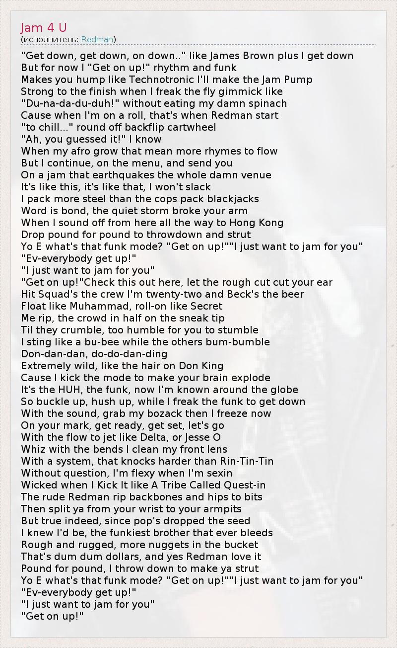 "Get down, get down, on down.." like James Brown plus I get down But for now I "Get on up!" rhythm and funk Makes you hump like Technotronic I'll make the Jam Pump Strong to the finish when I freak the fly gimmick like "Du-na-da-du-duh!" without eating my damn spinach Cause when I'm on a roll, that's when Redman start "to chill..." round off backflip cartwheel "Ah, you guessed it!" I know When my afro grow that mean more rhymes to flow But I continue, on the menu, and send you On a jam that earthquakes the whole damn venue It's like this, it's like that, I won't slack I pack more steel than the cops pack blackjacks Word is bond, the quiet storm broke your arm When I sound off from here all the way to Hong Kong Drop pound for pound to throwdown and strut Yo E what's that funk mode? "Get on up!""I just want to jam for you" "Ev-everybody get up!" "I just want to jam for you" "Get on up!"Check this out here, let the rough cut cut your ear Hit Squad's the crew I'm twenty-two and Beck's the beer Float like Muhammad, roll-on like Secret Me rip, the crowd in half on the sneak tip Til they crumble, too humble for you to stumble I sting like a bu-bee while the others bum-bumble Don-dan-dan, do-do-dan-ding Extremely wild, like the hair on Don King Cause I kick the mode to make your brain explode It's the HUH, the funk, now I'm known around the globe So buckle up, hush up, while I freak the funk to get down With the sound, grab my bozack then I freeze now On your mark, get ready, get set, let's go With the flow to jet like Delta, or Jesse O Whiz with the bends I clean my front lens With a system, that knocks harder than Rin-Tin-Tin Without question, I'm flexy when I'm sexin Wicked when I Kick It like A Tribe Called Quest-in The rude Redman rip backbones and hips to bits Then split ya from your wrist to your armpits But true indeed, since pop's dropped the seed I knew I'd be, the funkiest brother that ever bleeds Rough and rugged, more nuggets in the bucket That's dum dum dollars, and yes Redman love it Pound for pound, I throw down to make ya strut Yo E what's that funk mode? "Get on up!""I just want to jam for you" "Ev-everybody get up!" "I just want to jam for you" "Get on up!"