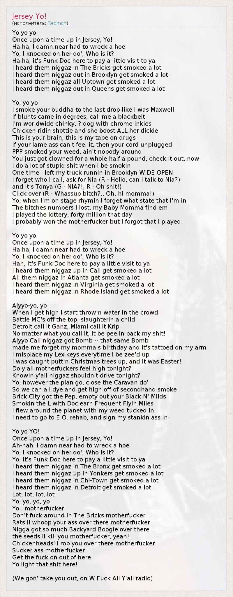 Эй эй эй Когда-то давно в Джерси Эй! Ха ха я являюсь проклятым, рядом должен был разрушить мотыгу Эй я стучал в нее, делают', "Кто это?" Ха ха это - фанковый Доктор здесь, чтобы нанести небольшой визит ya Я услышал их, niggaz в Кирпичах является копченым много Я услышал их, niggaz в Бруклине является копченым много Я услышал их niggaz, все Жилые кварталы города являются копчеными много Я услышал их, niggaz в Куинсе является копченым много Эй эй эй Я курю Вашего Будду к последнему снижению как, я был Максвеллом Если короткие иголки прибыли в степени, назовите меня blackbelt Я являюсь во всем мире потрескавшимся? собака с хромом inkies Цыпленок ridin shottie и она повышает ВЕСЬ свой dickie Это - Ваш мозг, это - моя лента на наркотиках Если Ваша хромая задница не может чувствовать это, то Ваш шнур, отключенный PPP курил Ваш сорняк, никто вокруг Вы только получили clowned для целой половины фунта, проверьте его, теперь Я делаю много глупого дерьма когда я быть smokin Одно время я оставил свой грузовик runnin в Бруклине ШИРОКО ОТКРЫТЫМ Я забываю, кого я называю, прошу Nia (R - "Привет, я могу говорить с Nia?") и это - Тоня (Г - "NIA?!", R - "О дерьмо!") Щелкните по (R - "Сука Whassup?".. "О, привет мама!") Эй, когда я нахожусь на стадии rhymin, я забываю то, что заявляет, что я нахожусь в Числа сук, которые я потерял, моя Маленькая Мама, находят их Я играл лотерею, сорок миллионов в тот день Я, вероятно, выиграл негодяя, но я забыл, что играл! Эй эй эй Когда-то давно в Джерси, Эй! Ха ха, я являюсь проклятым, рядом должен был разрушить мотыгу Эй, я стучал в нее, делают', "Кто это?" Ха, это - фанковый Доктор здесь, чтобы нанести небольшой визит ya Я услышал их, niggaz в Кали является копченым много Все их niggaz в Атланте являются копчеными много Я услышал их, niggaz в Вирджинии является копченым много Я услышал их, niggaz в Род-Айленде является копченым много Aiyyo-эй, эй Когда я становлюсь высоким, я начинаю воду вбрасывания в толпе Боритесь против Мегагерца от вершины, slaughterin ребенок Детройт называет это Ganz, Майами называет это Krip Независимо от того, что Вы называете этим, это быть peelin поддерживает мое дерьмо! Aiyyo Кали niggaz получил Бомбу - та же самая Бомба сделанный мной забыть день рождения моей мамы и это - tattoed на моей руке Я кладу свои ключи Лекса не на место каждый раз я быть zee'd Я был схвачен puttin Рождественские елки, и это был Истер! Негодяи y'all чувствуют себя высокими сегодня вечером? Knowin y'all niggaz не должен двигаться сегодня вечером? Эй, однако план идет, закрывается, Автоприцеп делают' Таким образом, мы можем все окрасить и стать высокими от подержанного дыма Кирпичный Город получил Бодрость духа, опустошите свой Черный N' Milds Smokin L с Доктором зарабатывают Частые Мили Flyin Я облетал вокруг планеты со своим сорняком, прикрытым Я должен пойти в реабилитацию E.O., и заключить контракт с stankin задницей в! Эй эй ЭЙ! Когда-то давно в Джерси, Эй! Ах ха, я являюсь проклятым, рядом должен был разрушить мотыгу Эй, я стучал в нее, делают', "Кто это?" Эй, это - фанковый Доктор здесь, чтобы нанести небольшой визит ya Я услышал их, niggaz в Бронксе является копченым много Я услышал их, niggaz в Йонкерсе является копченым много Я услышал их, niggaz в Chi-городе является копченым много Я услышал их, niggaz в Детройте является копченым много Партия, партия, партия, партия Эй, эй, эй, эй Эй.. негодяй Не возитесь в негодяе Кирпичей Rats'll кричат Вашу задницу там негодяй Нигга получил так много Буги-вуги Заднего дв