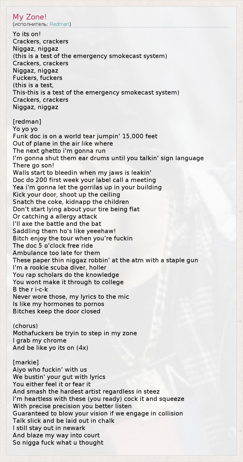 Yo its on! Crackers, crackers Niggaz, niggaz (this is a test of the emergency smokecast system) Crackers, crackers Niggaz, niggaz Fuckers, fuckers (this is a test, This-this is a test of the emergency smokecast system) Crackers, crackers Niggaz, niggaz [redman] Yo yo yo Funk doc is on a world tear jumpin' 15,000 feet Out of plane in the air like where The next ghetto i'm gonna run I'm gonna shut them ear drums until you talkin' sign language There go son! Walls start to bleedin when my jaws is leakin' Doc do 200 first week your label call a meeting Yea i'm gonna let the gorrilas up in your building Kick your door, shoot up the ceiling Snatch the coke, kidnapp the children Don't start lying about your tire being flat Or catching a allergy attack I'll axe the battle and the bat Saddling them ho's like yeeehaw! Bitch enjoy the tour when you're fuckin The doc 5 o'clock free ride Ambulance too late for them These paper thin niggaz robbin' at the atm with a staple gun I'm a rookie scuba diver, holler You rap scholars do the knowledge You wont make it through to college B the r i-c-k Never wore those, my lyrics to the mic Is like my hormones to pornos Bitches keep the door closed (chorus) Mothafuckers be tryin to step in my zone I grab my chrome And be like yo its on (4x) [markie] Aiyo who fuckin' with us We bustin' your gut with lyrics You either feel it or fear it And smash the hardest artist regardless in steez I'm heartless with these (you ready) cock it and squeeze With precise precision you better listen Guaranteed to blow your vision if we engage in collision Talk slick and be laid out in chalk I still stay out in newark And blaze my way into court So nigga fuck what u thought