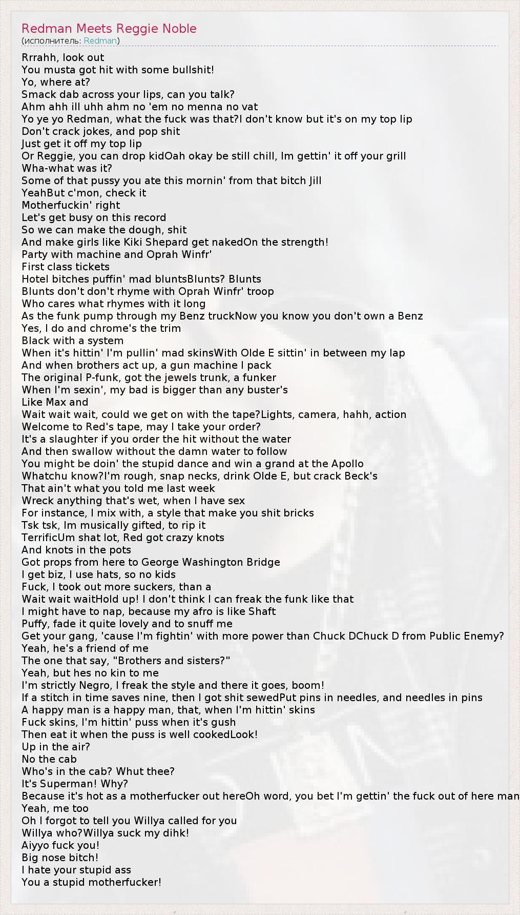 Rrrahh, look out You musta got hit with some bullshit! Yo, where at? Smack dab across your lips, can you talk? Ahm ahh ill uhh ahm no 'em no menna no vat Yo ye yo Redman, what the fuck was that?I don't know but it's on my top lip Don't crack jokes, and pop shit Just get it off my top lip Or Reggie, you can drop kidOah okay be still chill, Im gettin' it off your grill Wha-what was it? Some of that pussy you ate this mornin' from that bitch Jill YeahBut c'mon, check it Motherfuckin' right Let's get busy on this record So we can make the dough, shit And make girls like Kiki Shepard get nakedOn the strength! Party with machine and Oprah Winfr' First class tickets Hotel bitches puffin' mad bluntsBlunts? Blunts Blunts don't don't rhyme with Oprah Winfr' troop Who cares what rhymes with it long As the funk pump through my Benz truckNow you know you don't own a Benz Yes, I do and chrome's the trim Black with a system When it's hittin' I'm pullin' mad skinsWith Olde E sittin' in between my lap And when brothers act up, a gun machine I pack The original P-funk, got the jewels trunk, a funker When I'm sexin', my bad is bigger than any buster's Like Max and Wait wait wait, could we get on with the tape?Lights, camera, hahh, action Welcome to Red's tape, may I take your order? It's a slaughter if you order the hit without the water And then swallow without the damn water to follow You might be doin' the stupid dance and win a grand at the Apollo Whatchu know?I'm rough, snap necks, drink Olde E, but crack Beck's That ain't what you told me last week Wreck anything that's wet, when I have sex For instance, I mix with, a style that make you shit bricks Tsk tsk, Im musically gifted, to rip it TerrificUm shat lot, Red got crazy knots And knots in the pots Got props from here to George Washington Bridge I get biz, I use hats, so no kids Fuck, I took out more suckers, than a Wait wait waitHold up! I don't think I can freak the funk like that I might have to nap, because my afro is like Shaft Puffy, fade it quite lovely and to snuff me Get your gang, 'cause I'm fightin' with more power than Chuck DChuck D from Public Enemy? Yeah, he's a friend of me The one that say, "Brothers and sisters?" Yeah, but hes no kin to me I'm strictly Negro, I freak the style and there it goes, boom! If a stitch in time saves nine, then I got shit sewedPut pins in needles, and needles in pins A happy man is a happy man, that, when I'm hittin' skins Fuck skins, I'm hittin' puss when it's gush Then eat it when the puss is well cookedLook! Up in the air? No the cab Who's in the cab? Whut thee? It's Superman! Why? Because it's hot as a motherfucker out hereOh word, you bet I'm gettin' the fuck out of here man Yeah, me too Oh I forgot to tell you Willya called for you Willya who?Willya suck my dihk! Aiyyo fuck you! Big nose bitch! I hate your stupid ass You a stupid motherfucker!