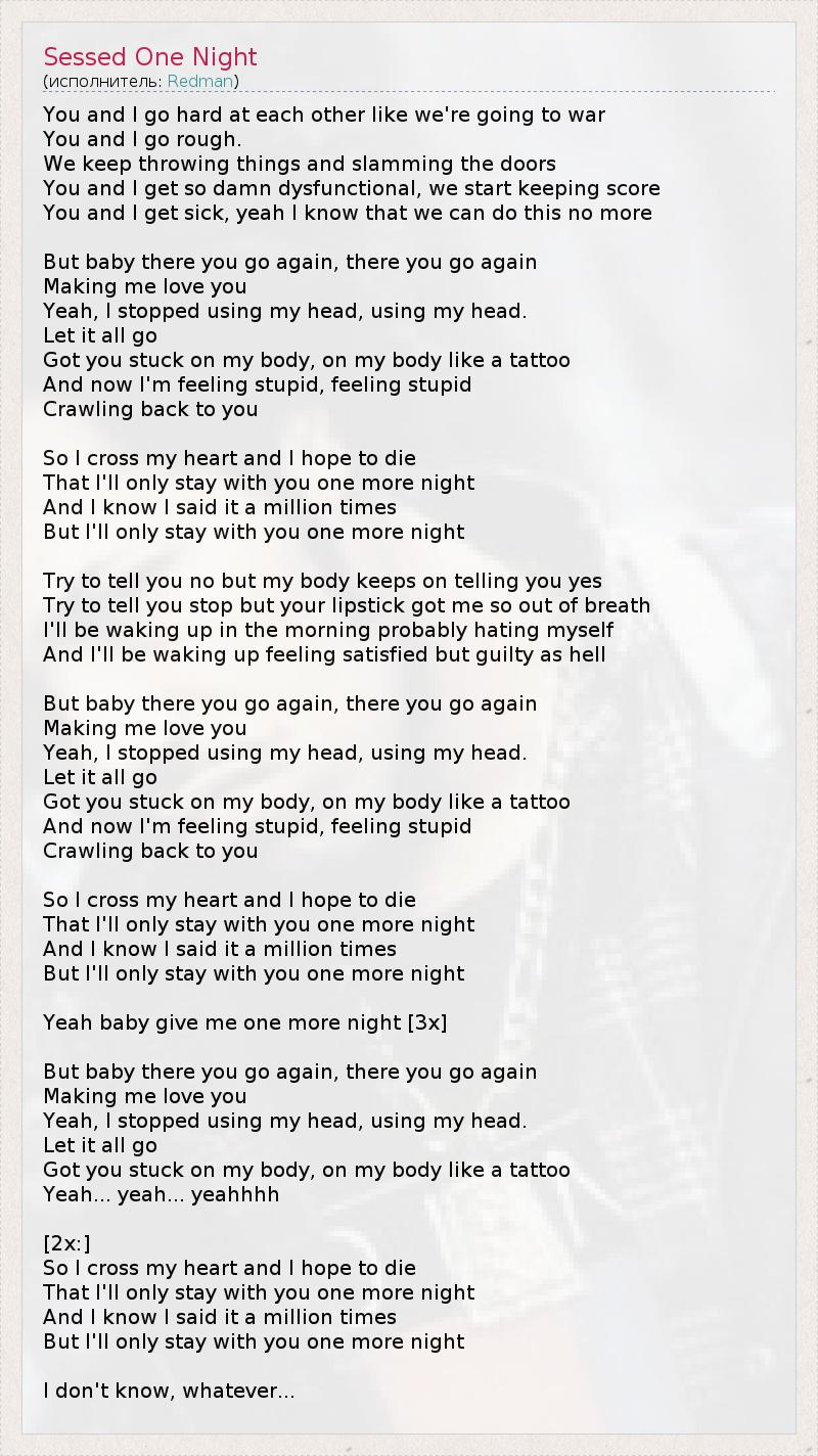 You and I go hard at each other like we're going to war You and I go rough. We keep throwing things and slamming the doors You and I get so damn dysfunctional, we start keeping score You and I get sick, yeah I know that we can do this no more But baby there you go again, there you go again Making me love you Yeah, I stopped using my head, using my head. Let it all go Got you stuck on my body, on my body like a tattoo And now I'm feeling stupid, feeling stupid Crawling back to you So I cross my heart and I hope to die That I'll only stay with you one more night And I know I said it a million times But I'll only stay with you one more night Try to tell you no but my body keeps on telling you yes Try to tell you stop but your lipstick got me so out of breath I'll be waking up in the morning probably hating myself And I'll be waking up feeling satisfied but guilty as hell But baby there you go again, there you go again Making me love you Yeah, I stopped using my head, using my head. Let it all go Got you stuck on my body, on my body like a tattoo And now I'm feeling stupid, feeling stupid Crawling back to you So I cross my heart and I hope to die That I'll only stay with you one more night And I know I said it a million times But I'll only stay with you one more night Yeah baby give me one more night [3x] But baby there you go again, there you go again Making me love you Yeah, I stopped using my head, using my head. Let it all go Got you stuck on my body, on my body like a tattoo Yeah... yeah... yeahhhh [2x:] So I cross my heart and I hope to die That I'll only stay with you one more night And I know I said it a million times But I'll only stay with you one more night I don't know, whatever...