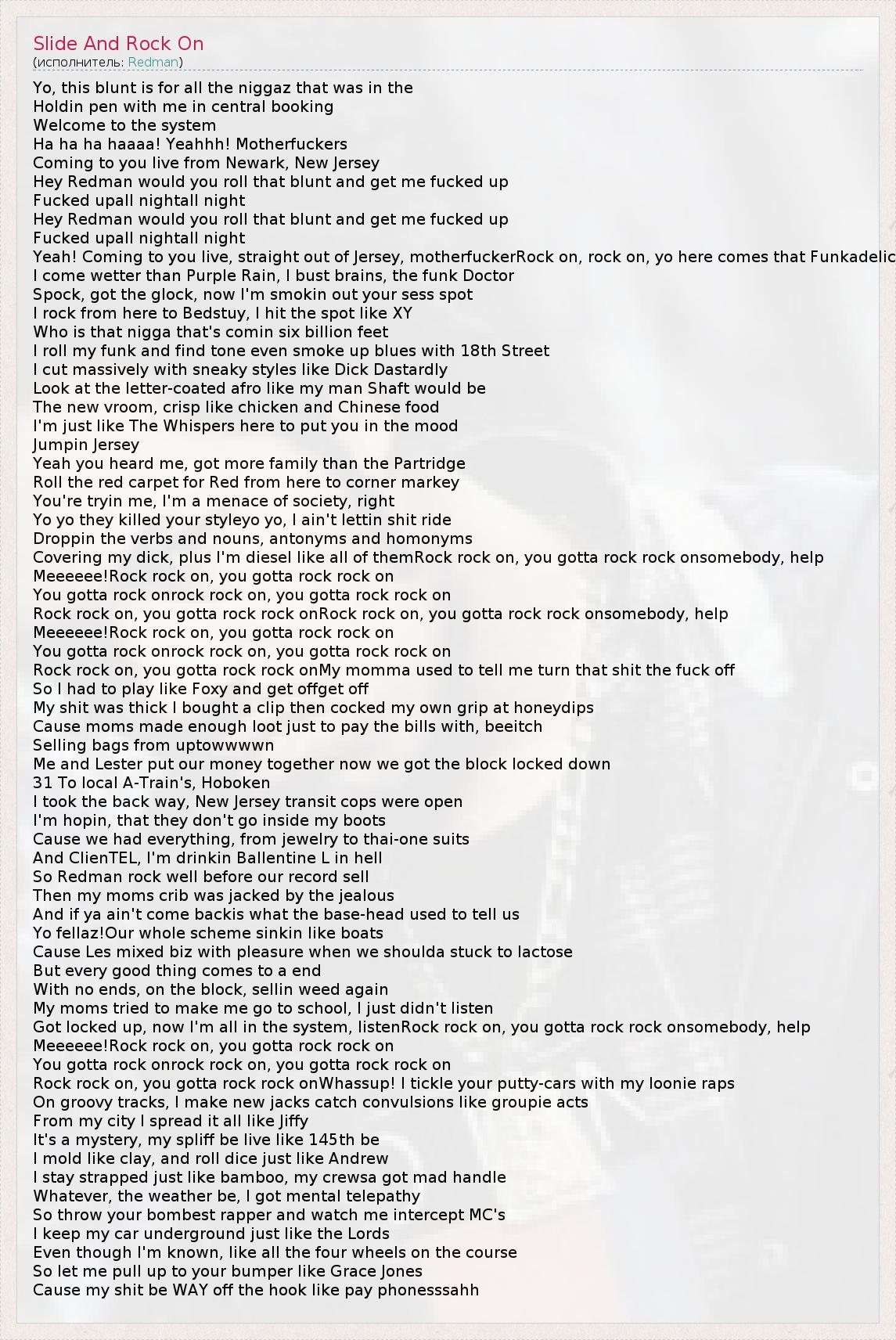 Yo, this blunt is for all the niggaz that was in the Holdin pen with me in central booking Welcome to the system Ha ha ha haaaa! Yeahhh! Motherfuckers Coming to you live from Newark, New Jersey Hey Redman would you roll that blunt and get me fucked up Fucked upall nightall night Hey Redman would you roll that blunt and get me fucked up Fucked upall nightall night Yeah! Coming to you live, straight out of Jersey, motherfuckerRock on, rock on, yo here comes that Funkadelic I come wetter than Purple Rain, I bust brains, the funk Doctor Spock, got the glock, now I'm smokin out your sess spot I rock from here to Bedstuy, I hit the spot like XY Who is that nigga that's comin six billion feet I roll my funk and find tone even smoke up blues with 18th Street I cut massively with sneaky styles like Dick Dastardly Look at the letter-coated afro like my man Shaft would be The new vroom, crisp like chicken and Chinese food I'm just like The Whispers here to put you in the mood Jumpin Jersey Yeah you heard me, got more family than the Partridge Roll the red carpet for Red from here to corner markey You're tryin me, I'm a menace of society, right Yo yo they killed your styleyo yo, I ain't lettin shit ride Droppin the verbs and nouns, antonyms and homonyms Covering my dick, plus I'm diesel like all of themRock rock on, you gotta rock rock onsomebody, help Meeeeee!Rock rock on, you gotta rock rock on You gotta rock onrock rock on, you gotta rock rock on Rock rock on, you gotta rock rock onRock rock on, you gotta rock rock onsomebody, help Meeeeee!Rock rock on, you gotta rock rock on You gotta rock onrock rock on, you gotta rock rock on Rock rock on, you gotta rock rock onMy momma used to tell me turn that shit the fuck off So I had to play like Foxy and get offget off My shit was thick I bought a clip then cocked my own grip at honeydips Cause moms made enough loot just to pay the bills with, beeitch Selling bags from uptowwwwn Me and Lester put our money together now we got the block locked down 31 To local A-Train's, Hoboken I took the back way, New Jersey transit cops were open I'm hopin, that they don't go inside my boots Cause we had everything, from jewelry to thai-one suits And ClienTEL, I'm drinkin Ballentine L in hell So Redman rock well before our record sell Then my moms crib was jacked by the jealous And if ya ain't come backis what the base-head used to tell us Yo fellaz!Our whole scheme sinkin like boats Cause Les mixed biz with pleasure when we shoulda stuck to lactose But every good thing comes to a end With no ends, on the block, sellin weed again My moms tried to make me go to school, I just didn't listen Got locked up, now I'm all in the system, listenRock rock on, you gotta rock rock onsomebody, help Meeeeee!Rock rock on, you gotta rock rock on You gotta rock onrock rock on, you gotta rock rock on Rock rock on, you gotta rock rock onWhassup! I tickle your putty-cars with my loonie raps On groovy tracks, I make new jacks catch convulsions like groupie acts From my city I spread it all like Jiffy It's a mystery, my spliff be live like 145th be I mold like clay, and roll dice just like Andrew I stay strapped just like bamboo, my crewsa got mad handle Whatever, the weather be, I got mental telepathy So throw your bombest rapper and watch me intercept MC's I keep my car underground just like the Lords Even though I'm known, like all the four wheels on the course So let me pull up to your bumper like Grace Jones Cause my shit be WAY off the hook like pay phonesssahh