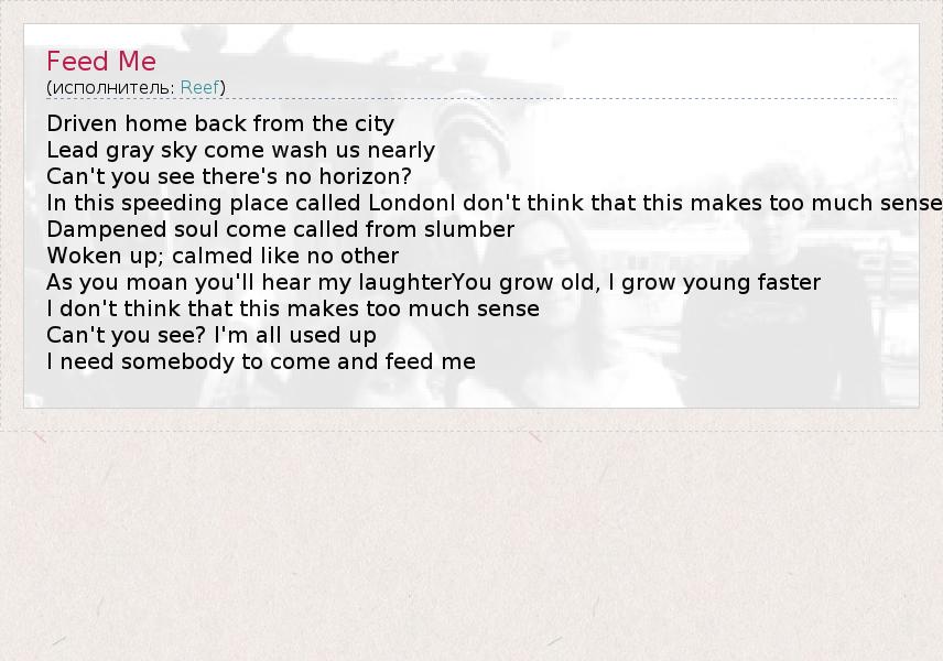 Driven home back from the city Lead gray sky come wash us nearly Can't you see there's no horizon? In this speeding place called LondonI don't think that this makes too much sense Dampened soul come called from slumber Woken up; calmed like no other As you moan you'll hear my laughterYou grow old, I grow young faster I don't think that this makes too much sense Can't you see? I'm all used up I need somebody to come and feed me