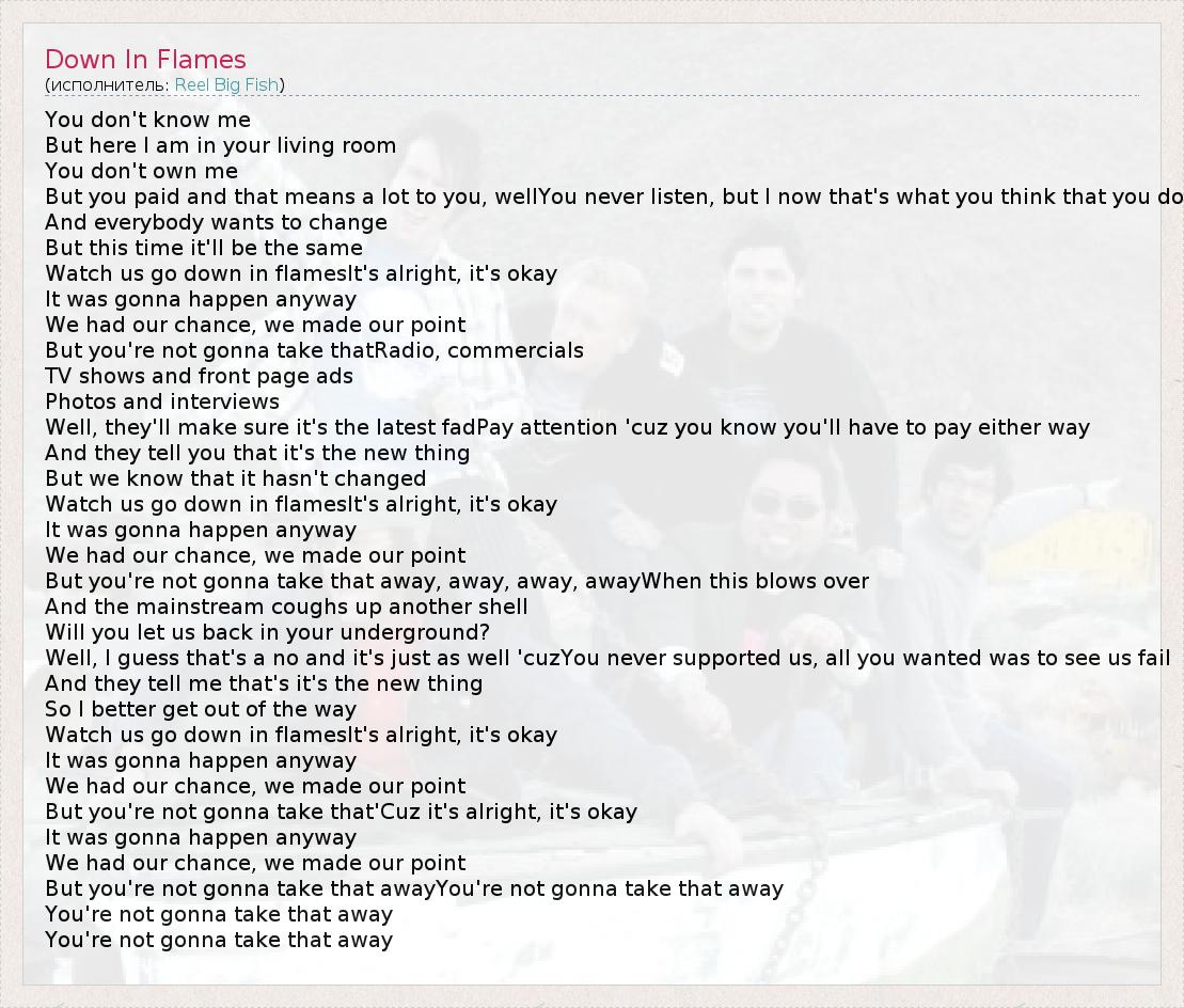 You don't know me But here I am in your living room You don't own me But you paid and that means a lot to you, wellYou never listen, but I now that's what you think that you do And everybody wants to change But this time it'll be the same Watch us go down in flamesIt's alright, it's okay It was gonna happen anyway We had our chance, we made our point But you're not gonna take thatRadio, commercials TV shows and front page ads Photos and interviews Well, they'll make sure it's the latest fadPay attention 'cuz you know you'll have to pay either way And they tell you that it's the new thing But we know that it hasn't changed Watch us go down in flamesIt's alright, it's okay It was gonna happen anyway We had our chance, we made our point But you're not gonna take that away, away, away, awayWhen this blows over And the mainstream coughs up another shell Will you let us back in your underground? Well, I guess that's a no and it's just as well 'cuzYou never supported us, all you wanted was to see us fail And they tell me that's it's the new thing So I better get out of the way Watch us go down in flamesIt's alright, it's okay It was gonna happen anyway We had our chance, we made our point But you're not gonna take that'Cuz it's alright, it's okay It was gonna happen anyway We had our chance, we made our point But you're not gonna take that awayYou're not gonna take that away You're not gonna take that away You're not gonna take that away