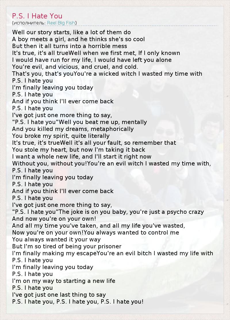 Well our story starts, like a lot of them do A boy meets a girl, and he thinks she's so cool But then it all turns into a horrible mess It's true, it's all trueWell when we first met, If I only known I would have run for my life, I would have left you alone You're evil, and vicious, and cruel, and cold. That's you, that's youYou're a wicked witch I wasted my time with P.S. I hate you I'm finally leaving you today P.S. I hate you And if you think I'll ever come back P.S. I hate you I've got just one more thing to say, "P.S. I hate you"Well you beat me up, mentally And you killed my dreams, metaphorically You broke my spirit, quite literally It's true, it's trueWell it's all your fault, so remember that You stole my heart, but now I'm taking it back I want a whole new life, and I'll start it right now Without you, without you!You're an evil witch I wasted my time with, P.S. I hate you I'm finally leaving you today P.S. I hate you And if you think I'll ever come back P.S. I hate you I've got just one more thing to say, "P.S. I hate you"The joke is on you baby, you're just a psycho crazy And now you're on your own! And all my time you've taken, and all my life you've wasted, Now you're on your own!You always wanted to control me You always wanted it your way But I'm so tired of being your prisoner I'm finally making my escapeYou're an evil bitch I wasted my life with P.S. I hate you I'm finally leaving you today P.S. I hate you I'm on my way to starting a new life P.S. I hate you I've got just one last thing to say P.S. I hate you, P.S. I hate you, P.S. I hate you!