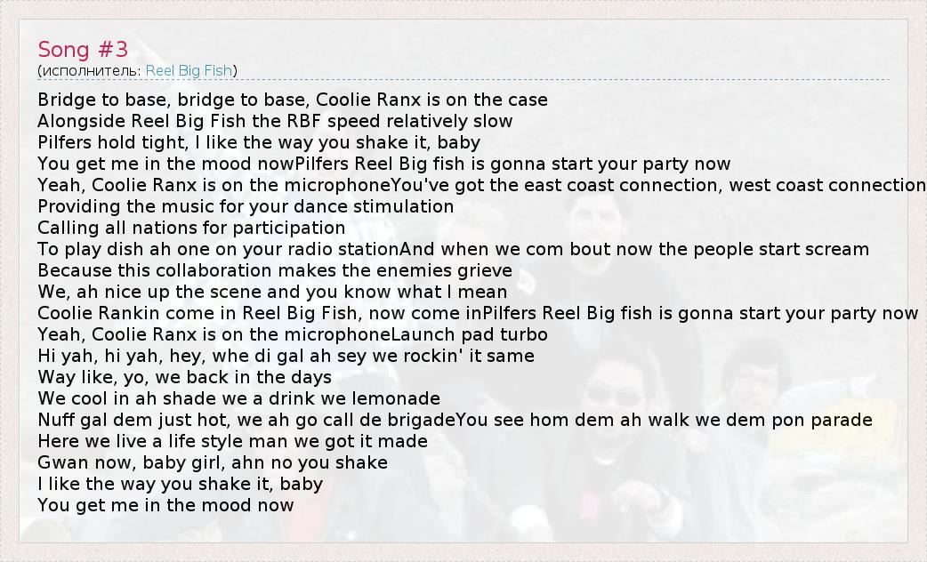 Bridge to base, bridge to base, Coolie Ranx is on the case Alongside Reel Big Fish the RBF speed relatively slow Pilfers hold tight, I like the way you shake it, baby You get me in the mood nowPilfers Reel Big fish is gonna start your party now Yeah, Coolie Ranx is on the microphoneYou've got the east coast connection, west coast connection Providing the music for your dance stimulation Calling all nations for participation To play dish ah one on your radio stationAnd when we com bout now the people start scream Because this collaboration makes the enemies grieve We, ah nice up the scene and you know what I mean Coolie Rankin come in Reel Big Fish, now come inPilfers Reel Big fish is gonna start your party now Yeah, Coolie Ranx is on the microphoneLaunch pad turbo Hi yah, hi yah, hey, whe di gal ah sey we rockin' it same Way like, yo, we back in the days We cool in ah shade we a drink we lemonade Nuff gal dem just hot, we ah go call de brigadeYou see hom dem ah walk we dem pon parade Here we live a life style man we got it made Gwan now, baby girl, ahn no you shake I like the way you shake it, baby You get me in the mood now