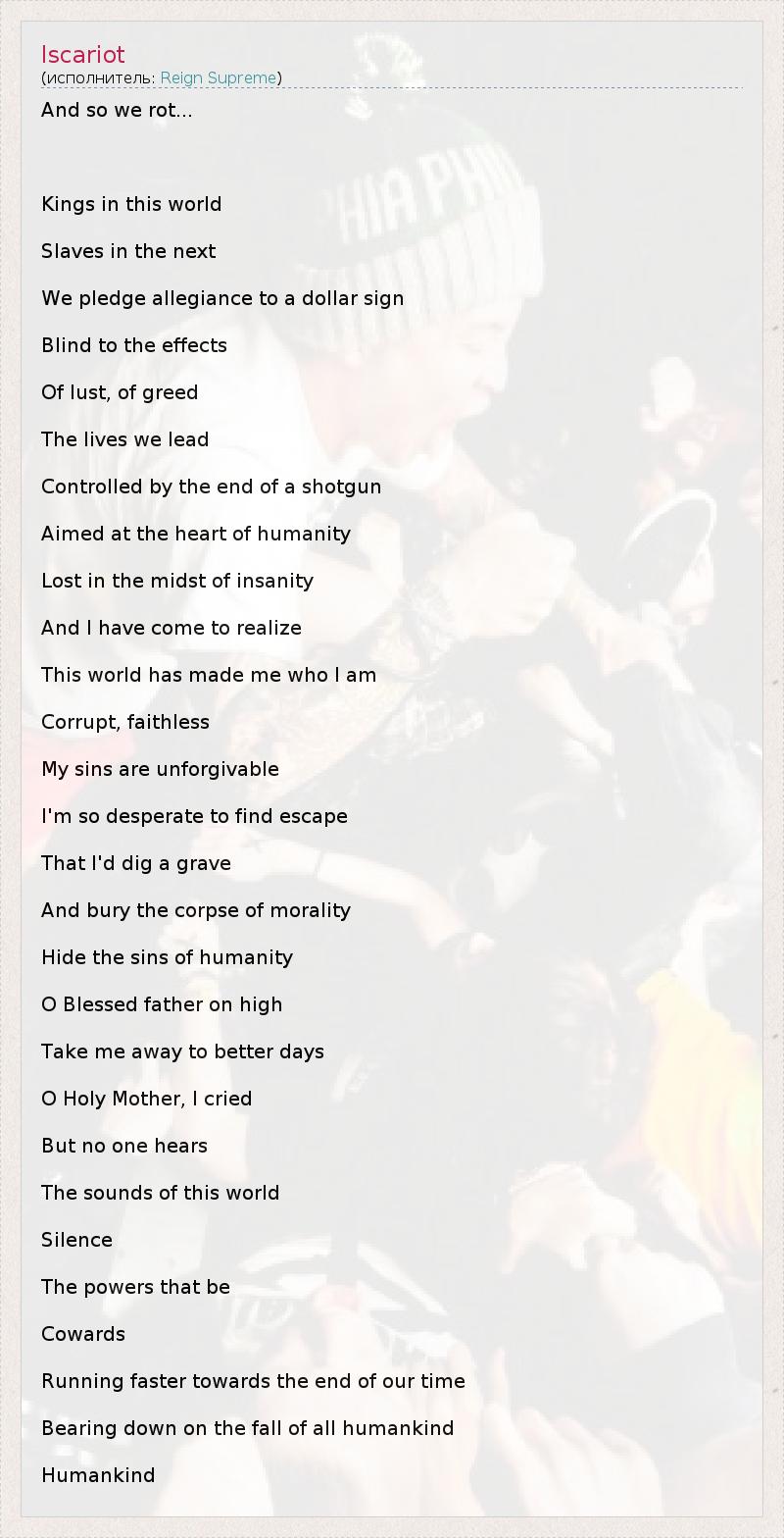 And so we rot... Kings in this world Slaves in the next We pledge allegiance to a dollar sign Blind to the effects Of lust, of greed The lives we lead Controlled by the end of a shotgun Aimed at the heart of humanity Lost in the midst of insanity And I have come to realize This world has made me who I am Corrupt, faithless My sins are unforgivable I'm so desperate to find escape That I'd dig a grave And bury the corpse of morality Hide the sins of humanity O Blessed father on high Take me away to better days O Holy Mother, I cried But no one hears The sounds of this world Silence The powers that be Cowards Running faster towards the end of our time Bearing down on the fall of all humankind Humankind