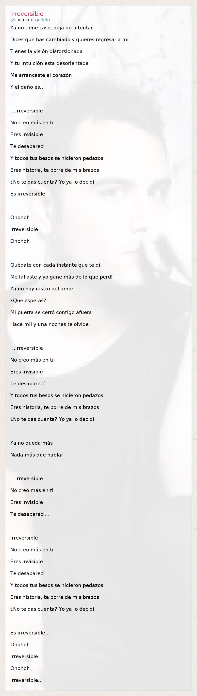 Ya no tiene caso, deja de intentar Dices que has cambiado y quieres regresar a mi Tienes la visión distorsionada Y tu intuición esta desorientada Me arrancaste el corazón Y el daño es… …Irreversible No creo más en ti Eres invisible Te desaparecí Y todos tus besos se hicieron pedazos Eres historia, te borre de mis brazos ¿No te das cuenta? Yo ya lo decidí Es irreversible Ohohoh Irreversible… Ohohoh Quédate con cada instante que te di Me fallaste y yo gane más de lo que perdí Ya no hay rastro del amor ¿Qué esperas? Mi puerta se cerró contigo afuera Hace mil y una noches te olvide …Irreversible No creo más en ti Eres invisible Te desaparecí Y todos tus besos se hicieron pedazos Eres historia, te borre de mis brazos ¿No te das cuenta? Yo ya lo decidí Ya no queda más Nada más que hablar …Irreversible No creo más en ti Eres invisible Te desaparecí… Irreversible No creo más en ti Eres invisible Te desaparecí Y todos tus besos se hicieron pedazos Eres historia, te borre de mis brazos ¿No te das cuenta? Yo ya lo decidí Es irreversible… Ohohoh Irreversible… Ohohoh Irreversible…