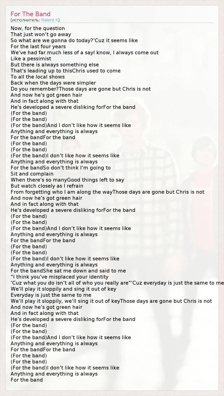 Это интересно:Relient K начался с дружбы Мэтта Хупса, Браина Питтмана и Мэтта Тиссона. Все трое парней ходили в одну церковь в городе Кантон (штат Огайо), вместе играли на гитарах, и сочиняли свои песни, мечтая о группе. В те ранние годы ребята висели на музыке NoFX, Blink 182, The Matches, Weezer, Jethro Tull, Ben Folds и Beach boys. Из христианских групп ребята слушали Mxpx, Ghoti Hook, Five Iron Frenzy, Slick Shoes, OC Supertones и т.п.Когда Мэтт Тиссон был... продолжение