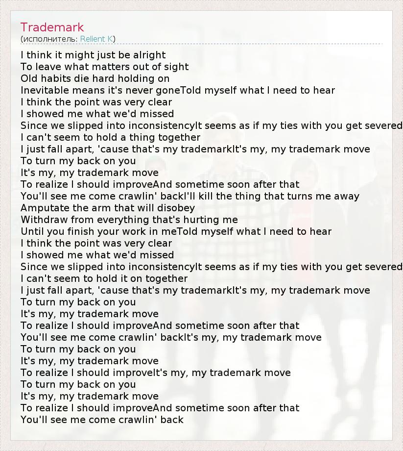 I think it might just be alright To leave what matters out of sight Old habits die hard holding on Inevitable means it's never goneTold myself what I need to hear I think the point was very clear I showed me what we'd missed Since we slipped into inconsistencyIt seems as if my ties with you get severed I can't seem to hold a thing together I just fall apart, 'cause that's my trademarkIt's my, my trademark move To turn my back on you It's my, my trademark move To realize I should improveAnd sometime soon after that You'll see me come crawlin' backI'll kill the thing that turns me away Amputate the arm that will disobey Withdraw from everything that's hurting me Until you finish your work in meTold myself what I need to hear I think the point was very clear I showed me what we'd missed Since we slipped into inconsistencyIt seems as if my ties with you get severed I can't seem to hold it on together I just fall apart, 'cause that's my trademarkIt's my, my trademark move To turn my back on you It's my, my trademark move To realize I should improveAnd sometime soon after that You'll see me come crawlin' backIt's my, my trademark move To turn my back on you It's my, my trademark move To realize I should improveIt's my, my trademark move To turn my back on you It's my, my trademark move To realize I should improveAnd sometime soon after that You'll see me come crawlin' back