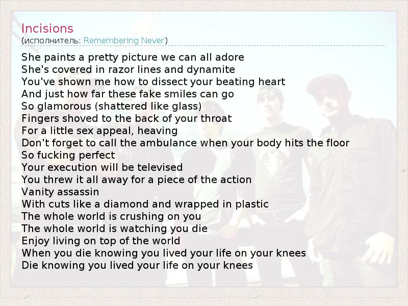 Это интересно:Remembering Never - американская металкор группа, сформированная в городе Форт-Лодердейл, штат Флорида, в конце 90-х годов. Ранние записи группы были сфокусированы на типичных вопросах, таких как потери и любовь. Вокалист Пит Ковальски решил изменить лирический фокус группы на их втором полноформатном CD Women And Children Die First. Группа больше... продолжение