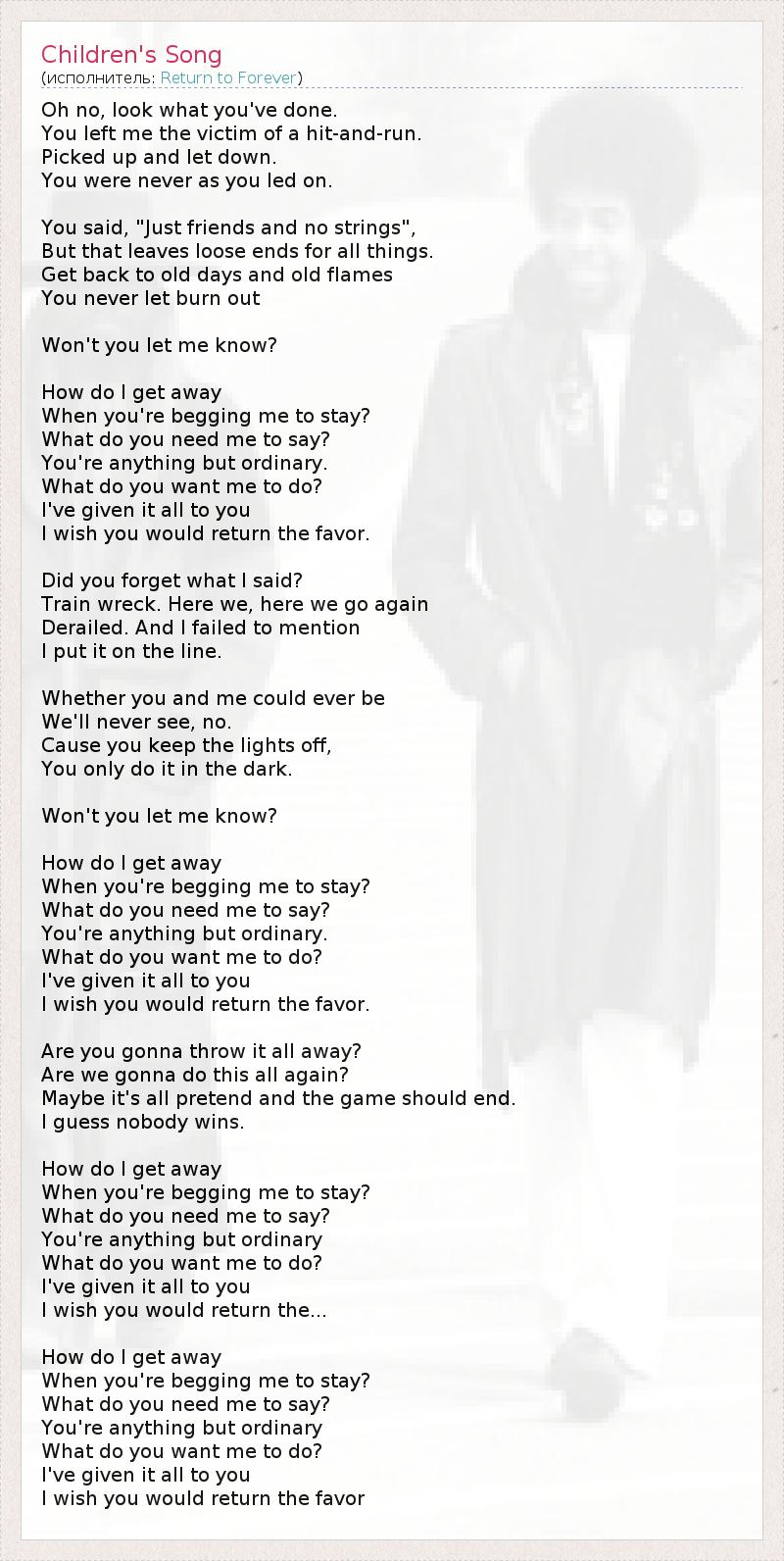 Oh no, look what you've done. You left me the victim of a hit-and-run. Picked up and let down. You were never as you led on. You said, "Just friends and no strings", But that leaves loose ends for all things. Get back to old days and old flames You never let burn out Won't you let me know? How do I get away When you're begging me to stay? What do you need me to say? You're anything but ordinary. What do you want me to do? I've given it all to you I wish you would return the favor. Did you forget what I said? Train wreck. Here we, here we go again Derailed. And I failed to mention I put it on the line. Whether you and me could ever be We'll never see, no. Cause you keep the lights off, You only do it in the dark. Won't you let me know? How do I get away When you're begging me to stay? What do you need me to say? You're anything but ordinary. What do you want me to do? I've given it all to you I wish you would return the favor. Are you gonna throw it all away? Are we gonna do this all again? Maybe it's all pretend and the game should end. I guess nobody wins. How do I get away When you're begging me to stay? What do you need me to say? You're anything but ordinary What do you want me to do? I've given it all to you I wish you would return the... How do I get away When you're begging me to stay? What do you need me to say? You're anything but ordinary What do you want me to do? I've given it all to you I wish you would return the favor