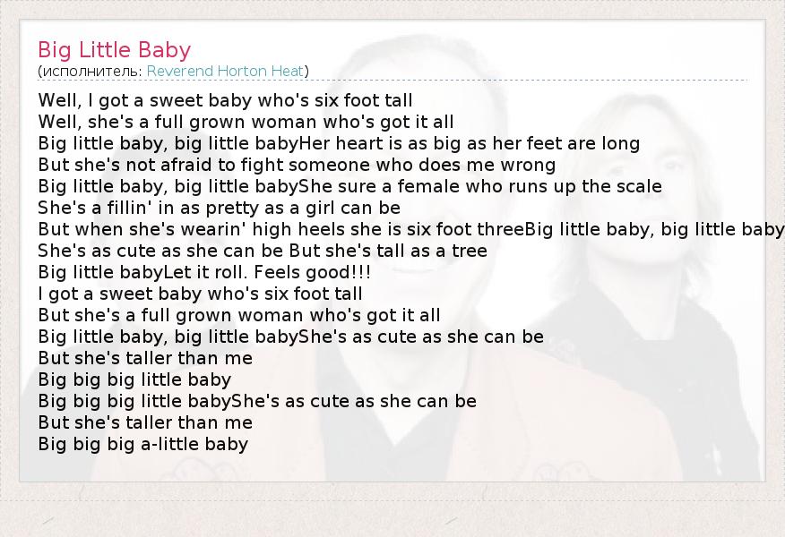 Well, I got a sweet baby who's six foot tall Well, she's a full grown woman who's got it all Big little baby, big little babyHer heart is as big as her feet are long But she's not afraid to fight someone who does me wrong Big little baby, big little babyShe sure a female who runs up the scale She's a fillin' in as pretty as a girl can be But when she's wearin' high heels she is six foot threeBig little baby, big little baby She's as cute as she can be But she's tall as a tree Big little babyLet it roll. Feels good!!! I got a sweet baby who's six foot tall But she's a full grown woman who's got it all Big little baby, big little babyShe's as cute as she can be But she's taller than me Big big big little baby Big big big little babyShe's as cute as she can be But she's taller than me Big big big a-little baby