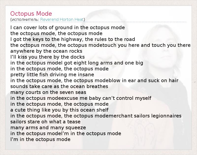 I can cover lots of ground in the octopus mode the octopus mode, the octopus mode I got the keys to the highway, the rules to the road the octopus mode, the octopus modetouch you here and touch you there anywhere by the ocean rocks I'll kiss you there by the docks in the octopus modeI got eight long arms and one big in the octopus mode, the octopus mode pretty little fish driving me insane in the octopus mode, the octopus modeblow in ear and suck on hair sounds take care as the ocean breathes many courts on the seven seas in the octopus modeexcuse me baby can't control myself in the octopus mode, the octopus mode a cute thing like you by this ocean shelf in the octopus mode, the octopus modemerchant sailors legionnaires sailors stare oh what a tease many arms and many squeeze in the octopus modeI'm in the octopus mode I'm in the octopus mode