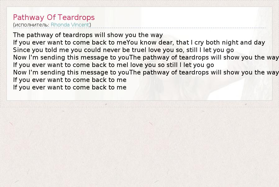 The pathway of teardrops will show you the way If you ever want to come back to meYou know dear, that I cry both night and day Since you told me you could never be trueI love you so, still I let you go Now I'm sending this message to youThe pathway of teardrops will show you the way If you ever want to come back to meI love you so still I let you go Now I'm sending this message to youThe pathway of teardrops will show you the way If you ever want to come back to me If you ever want to come back to me