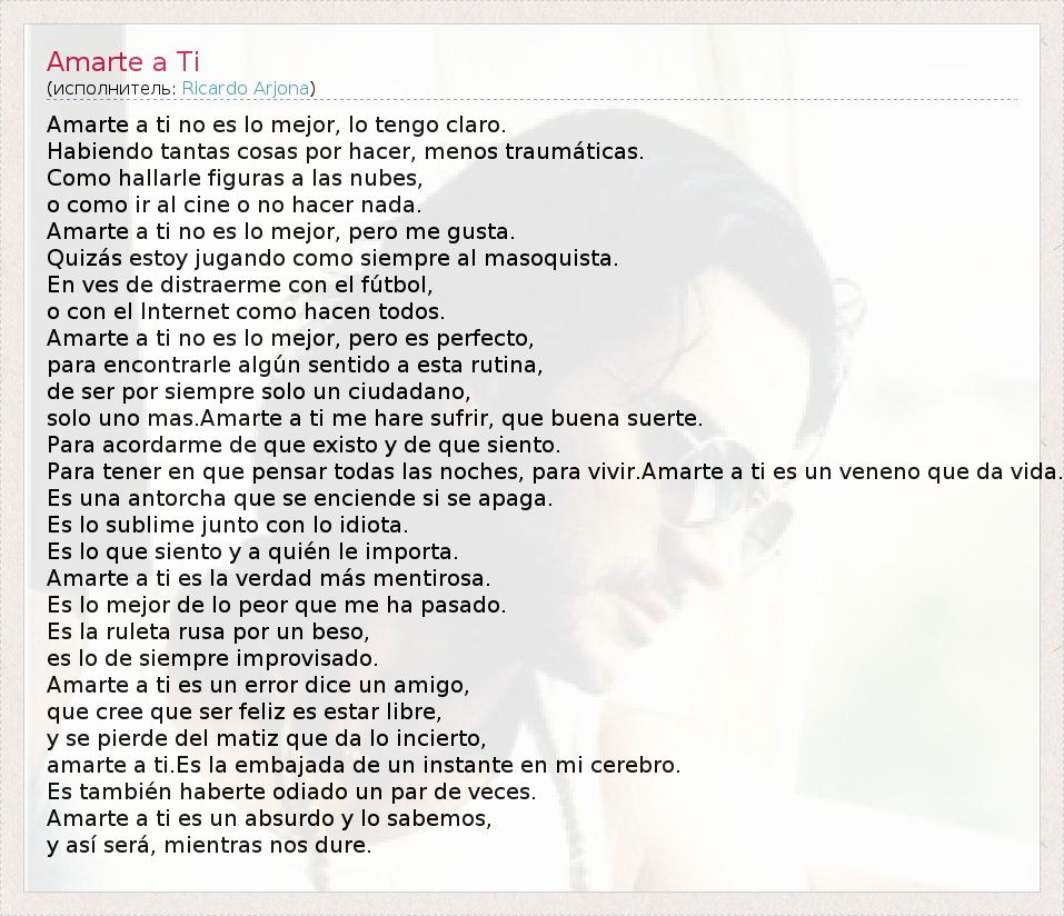 Это интересно:Гватемальский певец Ricardo Arjona родился 19 января 1964 в Антигуа (Гватемала). Когда ему исполнилось три года, его семья переехала в столицу, где прошло всё его детство. Там он начал свои академические и музыкальные исследования.В 8 лет Ricardo уже не погодам способный музыкант, который очень хорошо играет на гитаре. Он продолжает учиться, проходит период «трудного подростка», который повлек за... продолжение