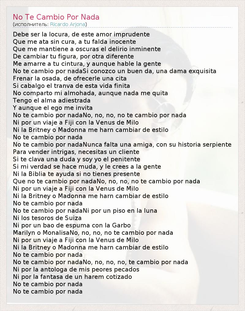 Debe ser la locura, de este amor imprudente Que me ata sin cura, a tu falda inocente Que me mantiene a oscuras el delirio inminente De cambiar tu figura, por otra diferente Me amarre a tu cintura, y aunque hable la gente No te cambio por nadaSi conozco un buen da, una dama exquisita Frenar la osada, de ofrecerle una cita Si cabalgo el tranva de esta vida finita No comparto mi almohada, aunque nada me quita Tengo el alma adiestrada Y aunque el ego me invita No te cambio por nadaNo, no, no, no te cambio por nada Ni por un viaje a Fiji con la Venus de Milo Ni la Britney o Madonna me harn cambiar de estilo No te cambio por nada No te cambio por nadaNunca falta una amiga, con su historia serpiente Para vender intrigas, necesitas un cliente Si te clava una duda y soy yo el penitente Si mi verdad se hace muda, y le crees a la gente Ni la Biblia te ayuda si no tienes presente Que no te cambio por nadaNo, no, no, no te cambio por nada Ni por un viaje a Fiji con la Venus de Milo Ni la Britney o Madonna me harn cambiar de estilo No te cambio por nada No te cambio por nadaNi por un piso en la luna Ni los tesoros de Suiza Ni por un bao de espuma con la Garbo Marilyn o MonalisaNo, no, no, no te cambio por nada Ni por un viaje a Fiji con la Venus de Milo Ni la Britney o Madonna me harn cambiar de estilo No te cambio por nada No te cambio por nadaNo, no, no, no, te cambio por nada Ni por la antologa de mis peores pecados Ni por la fantasa de un harem cotizado No te cambio por nada No te cambio por nada