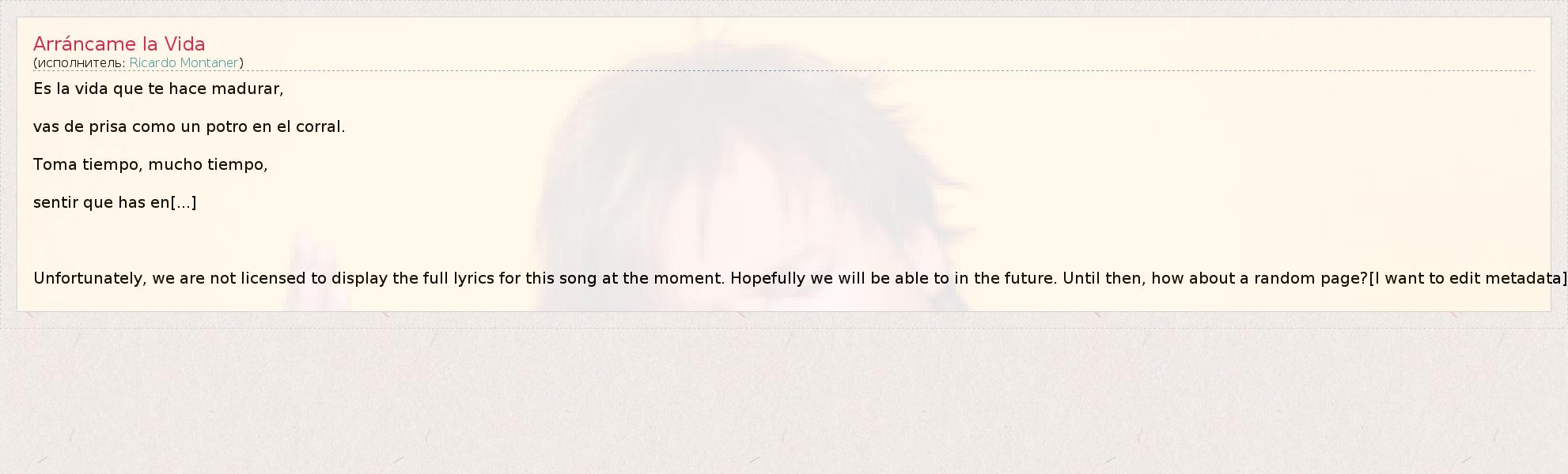 Es la vida que te hace madurar, vas de prisa como un potro en el corral. Toma tiempo, mucho tiempo, sentir que has en[...] Unfortunately, we are not licensed to display the full lyrics for this song at the moment. Hopefully we will be able to in the future. Until then, how about a random page?[I want to edit metadata]