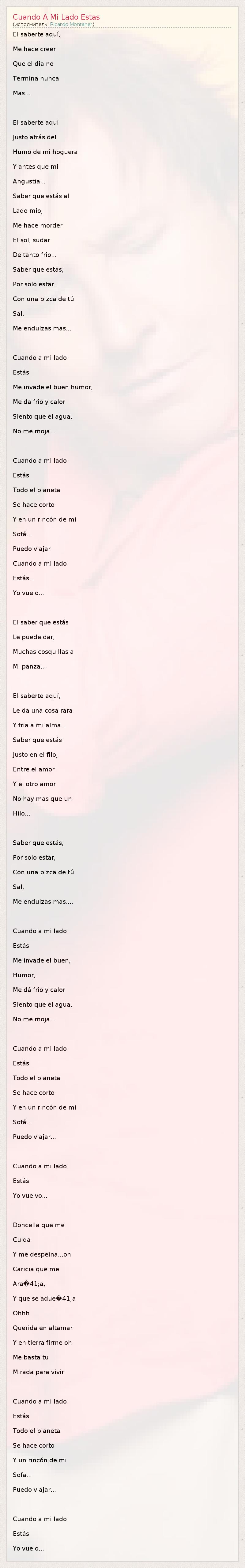 El saberte aquí, Me hace creer Que el dia no Termina nunca Mas... El saberte aquí Justo atrás del Humo de mi hoguera Y antes que mi Angustia... Saber que estás al Lado mio, Me hace morder El sol, sudar De tanto frio... Saber que estás, Por solo estar... Con una pizca de tú Sal, Me endulzas mas... Cuando a mi lado Estás Me invade el buen humor, Me da frio y calor Siento que el agua, No me moja... Cuando a mi lado Estás Todo el planeta Se hace corto Y en un rincón de mi Sofá... Puedo viajar Cuando a mi lado Estás... Yo vuelo... El saber que estás Le puede dar, Muchas cosquillas a Mi panza... El saberte aquí, Le da una cosa rara Y fria a mi alma... Saber que estás Justo en el filo, Entre el amor Y el otro amor No hay mas que un Hilo... Saber que estás, Por solo estar, Con una pizca de tú Sal, Me endulzas mas.... Cuando a mi lado Estás Me invade el buen, Humor, Me dá frio y calor Siento que el agua, No me moja... Cuando a mi lado Estás Todo el planeta Se hace corto Y en un rincón de mi Sofá... Puedo viajar... Cuando a mi lado Estás Yo vuelvo... Doncella que me Cuida Y me despeina...oh Caricia que me Ara�41;a, Y que se adue�41;a Ohhh Querida en altamar Y en tierra firme oh Me basta tu Mirada para vivir Cuando a mi lado Estás Todo el planeta Se hace corto Y un rincón de mi Sofa... Puedo viajar... Cuando a mi lado Estás Yo vuelo...
