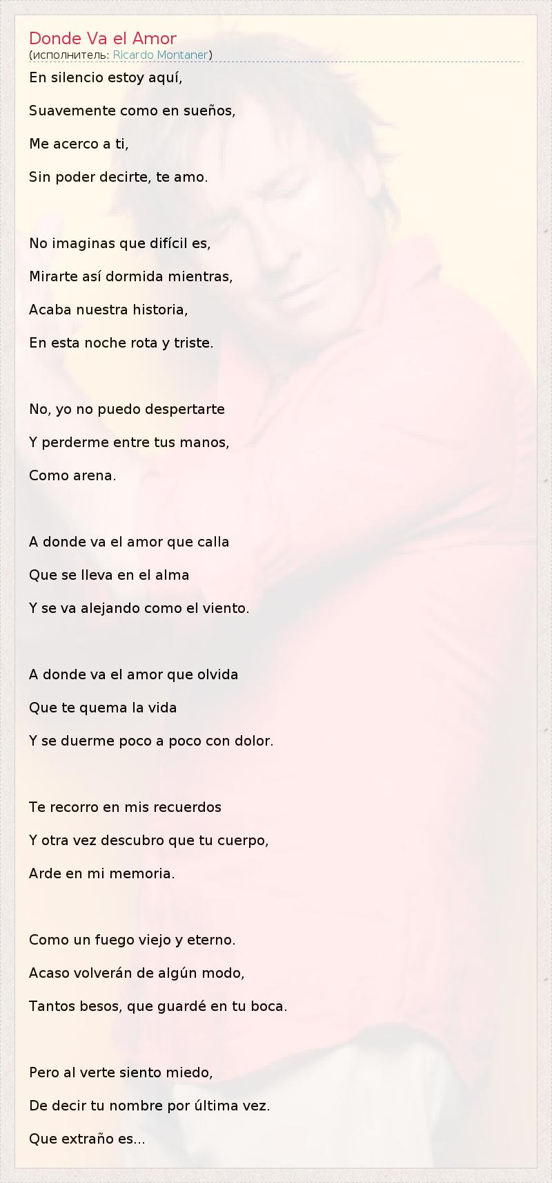 En silencio estoy aquí, Suavemente como en sueños, Me acerco a ti, Sin poder decirte, te amo. No imaginas que difícil es, Mirarte así dormida mientras, Acaba nuestra historia, En esta noche rota y triste. No, yo no puedo despertarte Y perderme entre tus manos, Como arena. A donde va el amor que calla Que se lleva en el alma Y se va alejando como el viento. A donde va el amor que olvida Que te quema la vida Y se duerme poco a poco con dolor. Te recorro en mis recuerdos Y otra vez descubro que tu cuerpo, Arde en mi memoria. Como un fuego viejo y eterno. Acaso volverán de algún modo, Tantos besos, que guardé en tu boca. Pero al verte siento miedo, De decir tu nombre por última vez. Que extraño es...