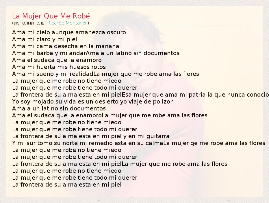 Ama mi cielo aunque amanezca oscuro Ama mi claro y mi piel Ama mi cama desecha en la manana Ama mi barba y mi andarAma a un latino sin documentos Ama el sudaca que la enamoro Ama mi huerta mis huesos rotos Ama mi sueno y mi realidadLa mujer que me robe ama las flores La mujer que me robe no tiene miedo La mujer que me robe tiene todo mi querer La frontera de su alma esta en mi pielEsa mujer que ama mi patria la que nunca conocio Yo soy mojado su vida es un desierto yo viaje de polizon Ama a un latino sin documentos Ama el sudaca que la enamoroLa mujer que me robe ama las flores La mujer que me robe no tiene miedo La mujer que me robe tiene todo mi querer La frontera de su alma esta en mi piel y en mi guitarra Y mi sur tomo su norte mi remedio esta en su calmaLa mujer qe me robe ama las flores La mujer que me robe no tiene miedo La mujer que me robe tiene todo mi querer La frontera de su alma esta en mi pielLa mujer que me robe ama las flores La mujer que me robe no tiene miedo La mujer que me robe tiene todo mi querer La frontera de su alma esta en mi piel