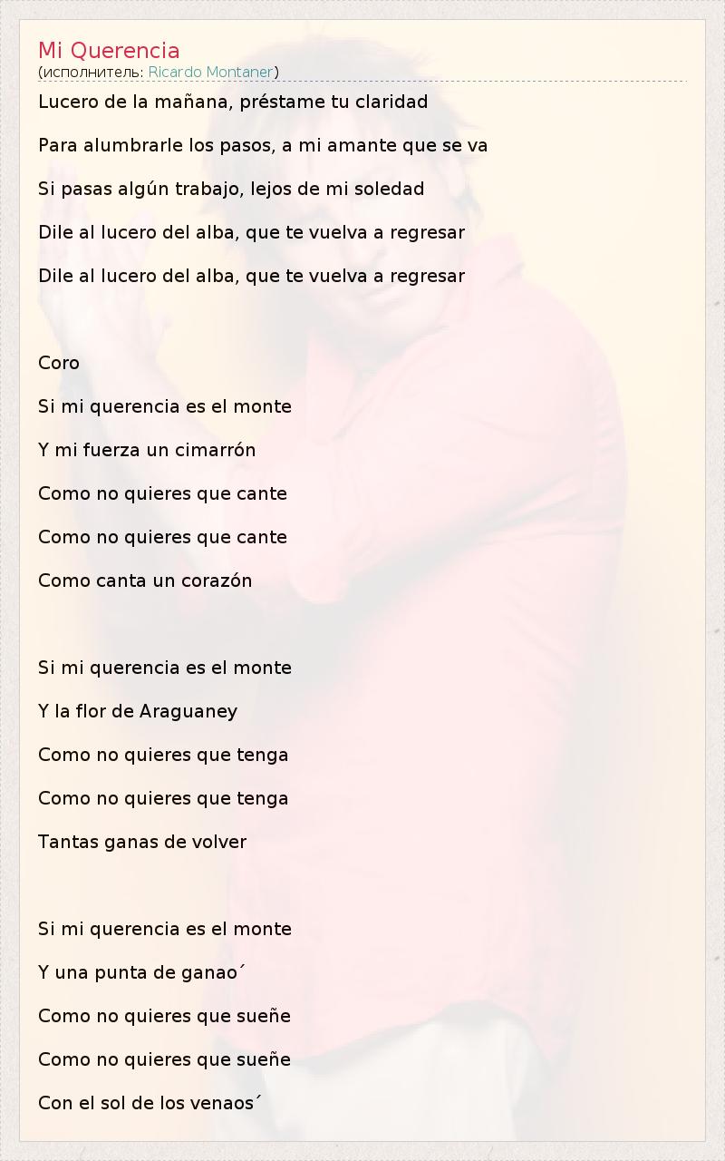 Lucero de la mañana, préstame tu claridad Para alumbrarle los pasos, a mi amante que se va Si pasas algún trabajo, lejos de mi soledad Dile al lucero del alba, que te vuelva a regresar Dile al lucero del alba, que te vuelva a regresar Coro Si mi querencia es el monte Y mi fuerza un cimarrón Como no quieres que cante Como no quieres que cante Como canta un corazón Si mi querencia es el monte Y la flor de Araguaney Como no quieres que tenga Como no quieres que tenga Tantas ganas de volver Si mi querencia es el monte Y una punta de ganao´ Como no quieres que sueñe Como no quieres que sueñe Con el sol de los venaos´