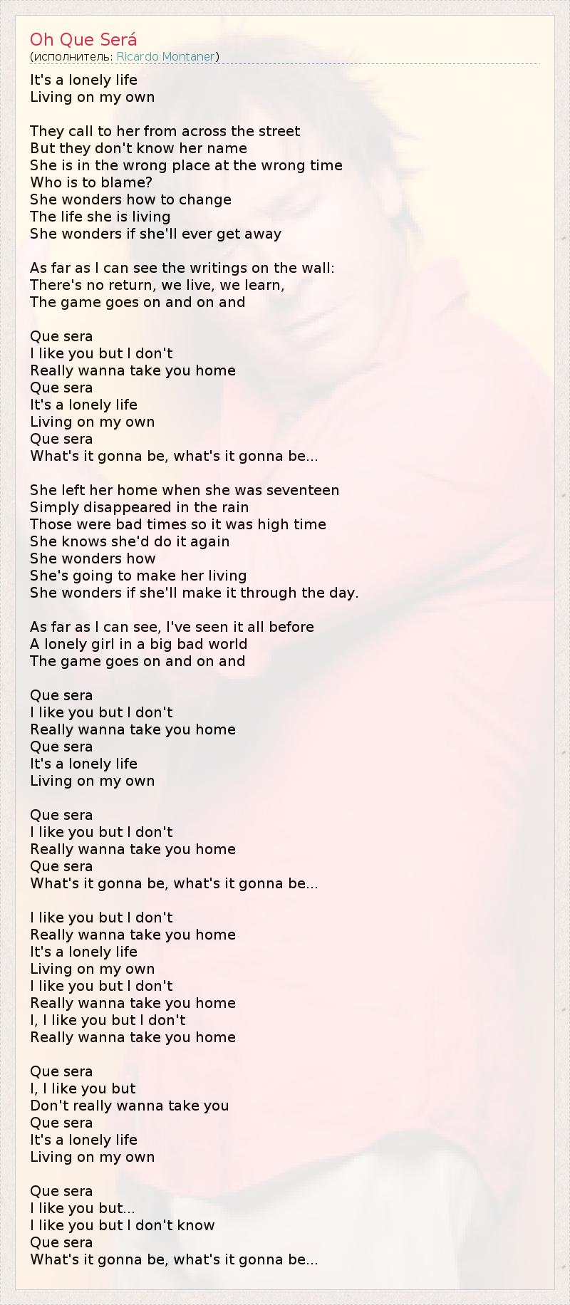 It's a lonely life Living on my own They call to her from across the street But they don't know her name She is in the wrong place at the wrong time Who is to blame? She wonders how to change The life she is living She wonders if she'll ever get away As far as I can see the writings on the wall: There's no return, we live, we learn, The game goes on and on and Que sera I like you but I don't Really wanna take you home Que sera It's a lonely life Living on my own Que sera What's it gonna be, what's it gonna be... She left her home when she was seventeen Simply disappeared in the rain Those were bad times so it was high time She knows she'd do it again She wonders how She's going to make her living She wonders if she'll make it through the day. As far as I can see, I've seen it all before A lonely girl in a big bad world The game goes on and on and Que sera I like you but I don't Really wanna take you home Que sera It's a lonely life Living on my own Que sera I like you but I don't Really wanna take you home Que sera What's it gonna be, what's it gonna be... I like you but I don't Really wanna take you home It's a lonely life Living on my own I like you but I don't Really wanna take you home I, I like you but I don't Really wanna take you home Que sera I, I like you but Don't really wanna take you Que sera It's a lonely life Living on my own Que sera I like you but... I like you but I don't know Que sera What's it gonna be, what's it gonna be...