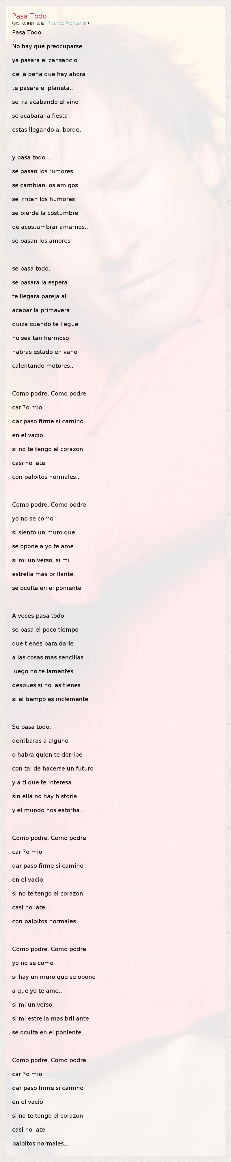 Pasa Todo No hay que preocuparse ya pasara el cansancio de la pena que hay ahora te pasara el planeta.. se ira acabando el vino se acabara la fiesta estas llegando al borde.. y pasa todo... se pasan los rumores.. se cambian los amigos se irritan los humores se pierde la costumbre de acostumbrar amarnos.. se pasan los amores se pasa todo. se pasara la espera te llegara pareja al acabar la primavera quiza cuando te llegue no sea tan hermoso. habras estado en vano calentando motores.. Como podre, Como podre cari?o mio dar paso firme si camino en el vacio si no te tengo el corazon casi no late con palpitos normales.. Como podre, Como podre yo no se como si siento un muro que se opone a yo te ame si mi universo, si mi estrella mas brillante, se oculta en el poniente A veces pasa todo. se pasa el poco tiempo que tienes para darle a las cosas mas sencillas luego no te lamentes despues si no las tienes si el tiempo es inclemente Se pasa todo. derribaras a alguno o habra quien te derribe con tal de hacerse un futuro y a ti que te interesa sin ella no hay historia y el mundo nos estorba.. Como podre, Como podre cari?o mio dar paso firme si camino en el vacio si no te tengo el corazon casi no late con palpitos normales Como podre, Como podre yo no se como si hay un muro que se opone a que yo te ame.. si mi universo, si mi estrella mas brillante se oculta en el poniente.. Como podre, Como podre cari?o mio dar paso firme si camino en el vacio si no te tengo el corazon casi no late palpitos normales..