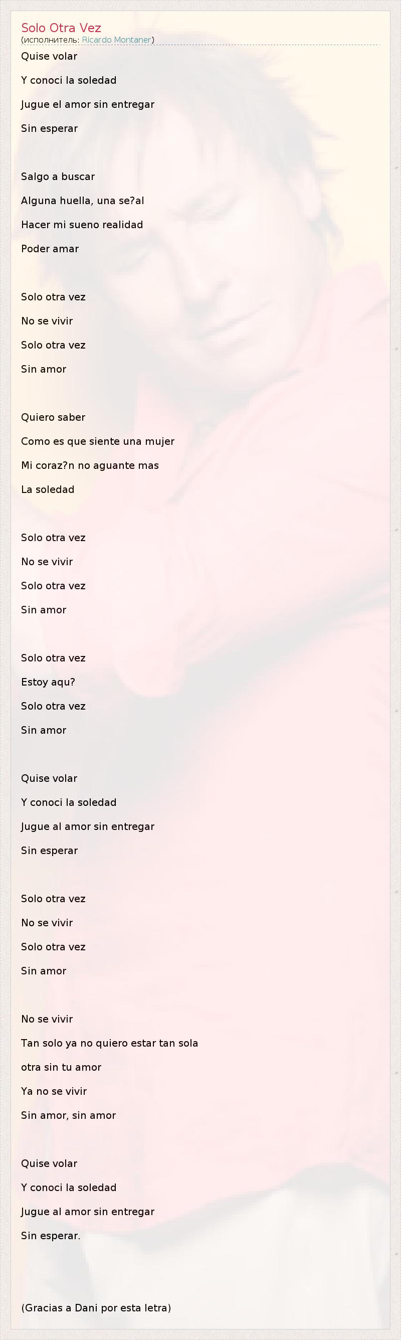 Quise volar Y conoci la soledad Jugue el amor sin entregar Sin esperar Salgo a buscar Alguna huella, una se?al Hacer mi sueno realidad Poder amar Solo otra vez No se vivir Solo otra vez Sin amor Quiero saber Como es que siente una mujer Mi coraz?n no aguante mas La soledad Solo otra vez No se vivir Solo otra vez Sin amor Solo otra vez Estoy aqu? Solo otra vez Sin amor Quise volar Y conoci la soledad Jugue al amor sin entregar Sin esperar Solo otra vez No se vivir Solo otra vez Sin amor No se vivir Tan solo ya no quiero estar tan sola otra sin tu amor Ya no se vivir Sin amor, sin amor Quise volar Y conoci la soledad Jugue al amor sin entregar Sin esperar. (Gracias a Dani por esta letra)