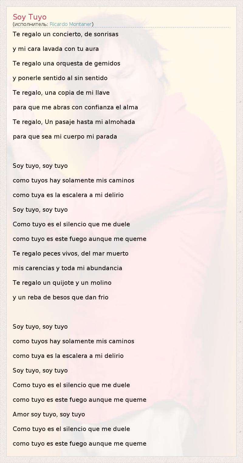 Te regalo un concierto, de sonrisas y mi cara lavada con tu aura Te regalo una orquesta de gemidos y ponerle sentido al sin sentido Te regalo, una copia de mi llave para que me abras con confianza el alma Te regalo, Un pasaje hasta mi almohada para que sea mi cuerpo mi parada Soy tuyo, soy tuyo como tuyos hay solamente mis caminos como tuya es la escalera a mi delirio Soy tuyo, soy tuyo Como tuyo es el silencio que me duele como tuyo es este fuego aunque me queme Te regalo peces vivos, del mar muerto mis carencias y toda mi abundancia Te regalo un quijote y un molino y un reba de besos que dan frio Soy tuyo, soy tuyo como tuyos hay solamente mis caminos como tuya es la escalera a mi delirio Soy tuyo, soy tuyo Como tuyo es el silencio que me duele como tuyo es este fuego aunque me queme Amor soy tuyo, soy tuyo Como tuyo es el silencio que me duele como tuyo es este fuego aunque me queme