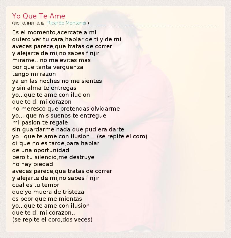 Es el momento,acercate a mi quiero ver tu cara,hablar de ti y de mi aveces parece,que tratas de correr y alejarte de mi,no sabes finjir mirame...no me evites mas por que tanta verguenza tengo mi razon ya en las noches no me sientes y sin alma te entregas yo...que te ame con ilucion que te di mi corazon no meresco que pretendas olvidarme yo... que mis suenos te entregue mi pasion te regale sin guardarme nada que pudiera darte yo...que te ame con ilusion....(se repite el coro) di que no es tarde,para hablar de una oportunidad pero tu silencio,me destruye no hay piedad aveces parece,que tratas de correr y alejarte de mi,no sabes finjir cual es tu temor que yo muera de tristeza es peor que me mientas yo...que te ame con ilusion que te di mi corazon... (se repite el coro,dos veces)