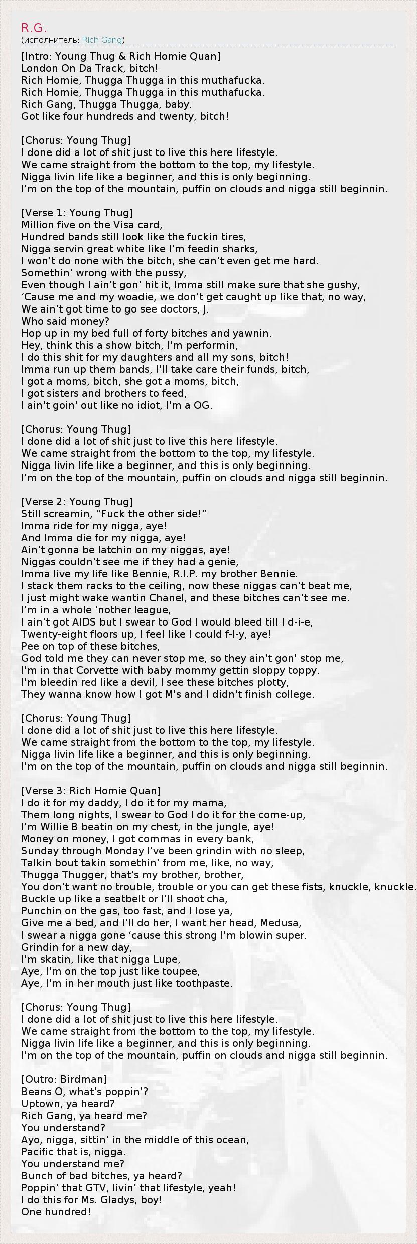 [Intro: Young Thug & Rich Homie Quan] London On Da Track, bitch! Rich Homie, Thugga Thugga in this muthafucka. Rich Homie, Thugga Thugga in this muthafucka. Rich Gang, Thugga Thugga, baby. Got like four hundreds and twenty, bitch! [Chorus: Young Thug] I done did a lot of shit just to live this here lifestyle. We came straight from the bottom to the top, my lifestyle. Nigga livin life like a beginner, and this is only beginning. I'm on the top of the mountain, puffin on clouds and nigga still beginnin. [Verse 1: Young Thug] Million five on the Visa card, Hundred bands still look like the fuckin tires, Nigga servin great white like I'm feedin sharks, I won't do none with the bitch, she can't even get me hard. Somethin' wrong with the pussy, Even though I ain't gon' hit it, Imma still make sure that she gushy, ‘Cause me and my woadie, we don't get caught up like that, no way, We ain't got time to go see doctors, J. Who said money? Hop up in my bed full of forty bitches and yawnin. Hey, think this a show bitch, I'm performin, I do this shit for my daughters and all my sons, bitch! Imma run up them bands, I'll take care their funds, bitch, I got a moms, bitch, she got a moms, bitch, I got sisters and brothers to feed, I ain't goin' out like no idiot, I'm a OG. [Chorus: Young Thug] I done did a lot of shit just to live this here lifestyle. We came straight from the bottom to the top, my lifestyle. Nigga livin life like a beginner, and this is only beginning. I'm on the top of the mountain, puffin on clouds and nigga still beginnin. [Verse 2: Young Thug] Still screamin, “Fuck the other side!” Imma ride for my nigga, aye! And Imma die for my nigga, aye! Ain't gonna be latchin on my niggas, aye! Niggas couldn't see me if they had a genie, Imma live my life like Bennie, R.I.P. my brother Bennie. I stack them racks to the ceiling, now these niggas can't beat me, I just might wake wantin Chanel, and these bitches can't see me. I'm in a whole ‘nother league, I ain't got AIDS but I swear to God I would bleed till I d-i-e, Twenty-eight floors up, I feel like I could f-l-y, aye! Pee on top of these bitches, God told me they can never stop me, so they ain't gon' stop me, I'm in that Corvette with baby mommy gettin sloppy toppy. I'm bleedin red like a devil, I see these bitches plotty, They wanna know how I got M's and I didn't finish college. [Chorus: Young Thug] I done did a lot of shit just to live this here lifestyle. We came straight from the bottom to the top, my lifestyle. Nigga livin life like a beginner, and this is only beginning. I'm on the top of the mountain, puffin on clouds and nigga still beginnin. [Verse 3: Rich Homie Quan] I do it for my daddy, I do it for my mama, Them long nights, I swear to God I do it for the come-up, I'm Willie B beatin on my chest, in the jungle, aye! Money on money, I got commas in every bank, Sunday through Monday I've been grindin with no sleep, Talkin bout takin somethin' from me, like, no way, Thugga Thugger, that's my brother, brother, You don't want no trouble, trouble or you can get these fists, knuckle, knuckle. Buckle up like a seatbelt or I'll shoot cha, Punchin on the gas, too fast, and I lose ya, Give me a bed, and I'll do her, I want her head, Medusa, I swear a nigga gone ‘cause this strong I'm blowin super. Grindin for a new day, I'm skatin, like that nigga Lupe, Aye, I'm on the top just like toupee, Aye, I'm in her mouth just like toothpaste. [Chorus: Young Thug] I done did a lot of shit just to live this here lifestyle. We came straight from the bottom to the top, my lifestyle. Nigga livin life like a beginner, and this is only beginning. I'm on the top of the mountain, puffin on clouds and nigga still beginnin. [Outro: Birdman] Beans O, what's poppin'? Uptown, ya heard? Rich Gang, ya heard me? You understand? Ayo, nigga, sittin' in the middle of this ocean, Pacific that is, nigga. You understand me? Bunch of bad bitches, ya heard? Poppin' that GTV, livin' that lifestyle, yeah! I do this for Ms. Gladys, boy! One hundred!