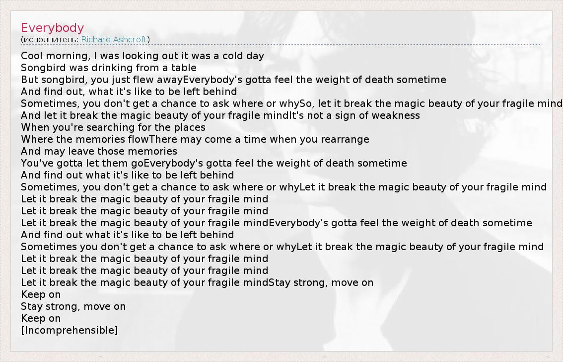 Let it break the magic beauty of your fragile mindEverybody's gotta feel the weight of death sometime