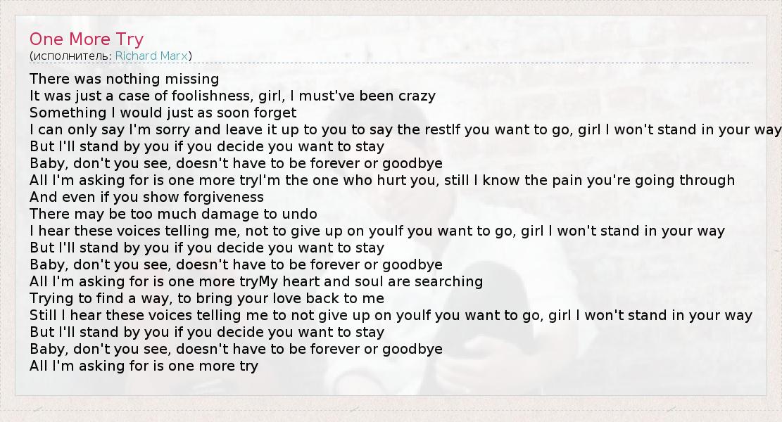 All I'm asking for is one more tryI'm the one who hurt you, still I know the pain you're going through