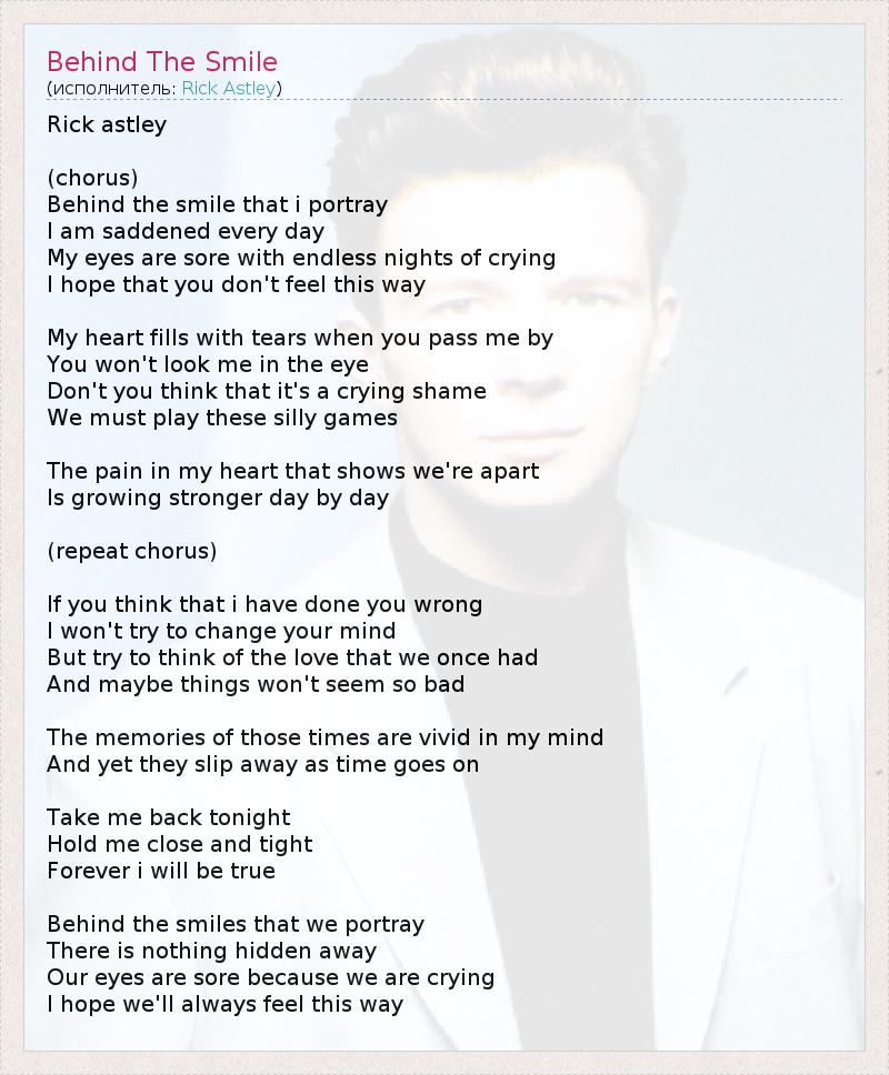 Rick astley (chorus) Behind the smile that i portray I am saddened every day My eyes are sore with endless nights of crying I hope that you don't feel this way My heart fills with tears when you pass me by You won't look me in the eye Don't you think that it's a crying shame We must play these silly games The pain in my heart that shows we're apart Is growing stronger day by day (repeat chorus) If you think that i have done you wrong I won't try to change your mind But try to think of the love that we once had And maybe things won't seem so bad The memories of those times are vivid in my mind And yet they slip away as time goes on Take me back tonight Hold me close and tight Forever i will be true Behind the smiles that we portray There is nothing hidden away Our eyes are sore because we are crying I hope we'll always feel this way