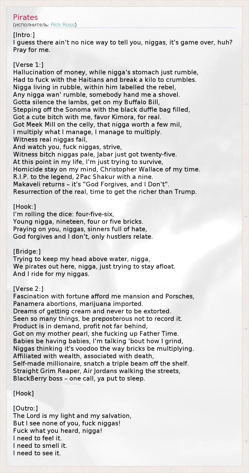 Это интересно:Rick Ross, наст. имя Уильям Леонард Робертс Второй (англ. William Leonard Roberts II, 28 января 1976 Кэрол-Сити, Флорида) — американский хип-хоп исполнитель. Создатель звукозаписывающего лейбла Maybach Music Group, который с 2008 года входит в состав Def Jam Recordings.Когда Росс учился в старших классах средней школы Кэрол-Сити, он играл в американский футбол, а позднее учился на футбольную стипендию в Государственном... продолжение
