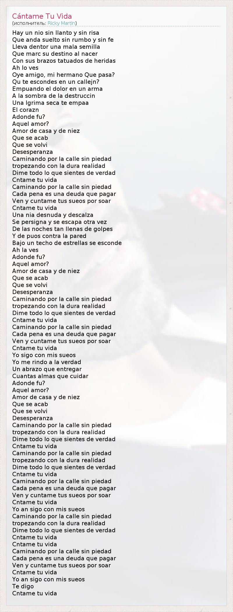 Hay un nio sin llanto y sin risa Que anda suelto sin rumbo y sin fe Lleva dentor una mala semilla Que marc su destino al nacer Con sus brazos tatuados de heridas Ah lo ves Oye amigo, mi hermano Que pasa? Qu te escondes en un callejn? Empuando el dolor en un arma A la sombra de la destruccin Una lgrima seca te empaa El corazn Adonde fu? Aquel amor? Amor de casa y de niez Que se acab Que se volvi Desesperanza Caminando por la calle sin piedad tropezando con la dura realidad Dime todo lo que sientes de verdad Cntame tu vida Caminando por la calle sin piedad Cada pena es una deuda que pagar Ven y cuntame tus sueos por soar Cntame tu vida Una nia desnuda y descalza Se persigna y se escapa otra vez De las noches tan llenas de golpes Y de puos contra la pared Bajo un techo de estrellas se esconde Ah la ves Adonde fu? Aquel amor? Amor de casa y de niez Que se acab Que se volvi Desesperanza Caminando por la calle sin piedad tropezando con la dura realidad Dime todo lo que sientes de verdad Cntame tu vida Caminando por la calle sin piedad Cada pena es una deuda que pagar Ven y cuntame tus sueos por soar Cntame tu vida Yo sigo con mis sueos Yo me rindo a la verdad Un abrazo que entregar Cuantas almas que cuidar Adonde fu? Aquel amor? Amor de casa y de niez Que se acab Que se volvi Desesperanza Caminando por la calle sin piedad tropezando con la dura realidad Dime todo lo que sientes de verdad Cntame tu vida Caminando por la calle sin piedad tropezando con la dura realidad Dime todo lo que sientes de verdad Cntame tu vida Caminando por la calle sin piedad Cada pena es una deuda que pagar Ven y cuntame tus sueos por soar Cntame tu vida Yo an sigo con mis sueos Caminando por la calle sin piedad tropezando con la dura realidad Dime todo lo que sientes de verdad Cntame tu vida Cntame tu vida Caminando por la calle sin piedad Cada pena es una deuda que pagar Ven y cuntame tus sueos por soar Cntame tu vida Yo an sigo con mis sueos Te digo Cntame tu vida