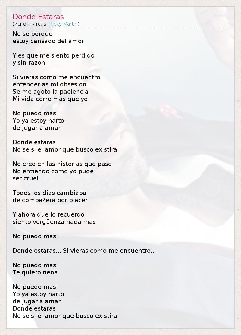 No se porque estoy cansado del amor Y es que me siento perdido y sin razon Si vieras como me encuentro entenderias mi obsesion Se me agoto la paciencia Mi vida corre mas que yo No puedo mas Yo ya estoy harto de jugar a amar Donde estaras No se si el amor que busco existira No creo en las historias que pase No entiendo como yo pude ser cruel Todos los dias cambiaba de compa?era por placer Y ahora que lo recuerdo siento vergüenza nada mas No puedo mas... Donde estaras... Si vieras como me encuentro... No puedo mas Te quiero nena No puedo mas Yo ya estoy harto de jugar a amar Donde estaras No se si el amor que busco existira