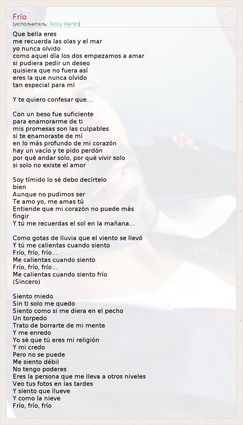 Que bella eres me recuerda las olas y el mar yo nunca olvido como aquel día los dos empezamos a amar si pudiera pedir un deseo quisiera que no fuera así eres la que nunca olvido tan especial para mí Y te quiero confesar que… Con un beso fue suficiente para enamorarme de ti mis promesas son las culpables si te enamoraste de mí en lo más profundo de mi corazón hay un vacío y te pido perdón por qué andar solo, por qué vivir solo si solo no existe el amor Soy tímido lo sé debo decírtelo bien Aunque no pudimos ser Te amo yo, me amas tú Entiende que mi corazón no puede más fingir Y tú me recuerdas el sol en la mañana… Como gotas de lluvia que el viento se llevó Y tú me calientas cuando siento Frío, frío, frío… Me calientas cuando siento Frío, frío, frío… Me calientas cuando siento frío (Sincero) Siento miedo Sin ti solo me quedo Siento como si me diera en el pecho Un torpedo Trato de borrarte de mi mente Y me enredo Yo sé que tú eres mi religión Y mi credo Pero no se puede Me siento débil No tengo poderes Eres la persona que me lleva a otros niveles Veo tus fotos en las tardes Y siento que llueve Y como la nieve Frío, frío, frío