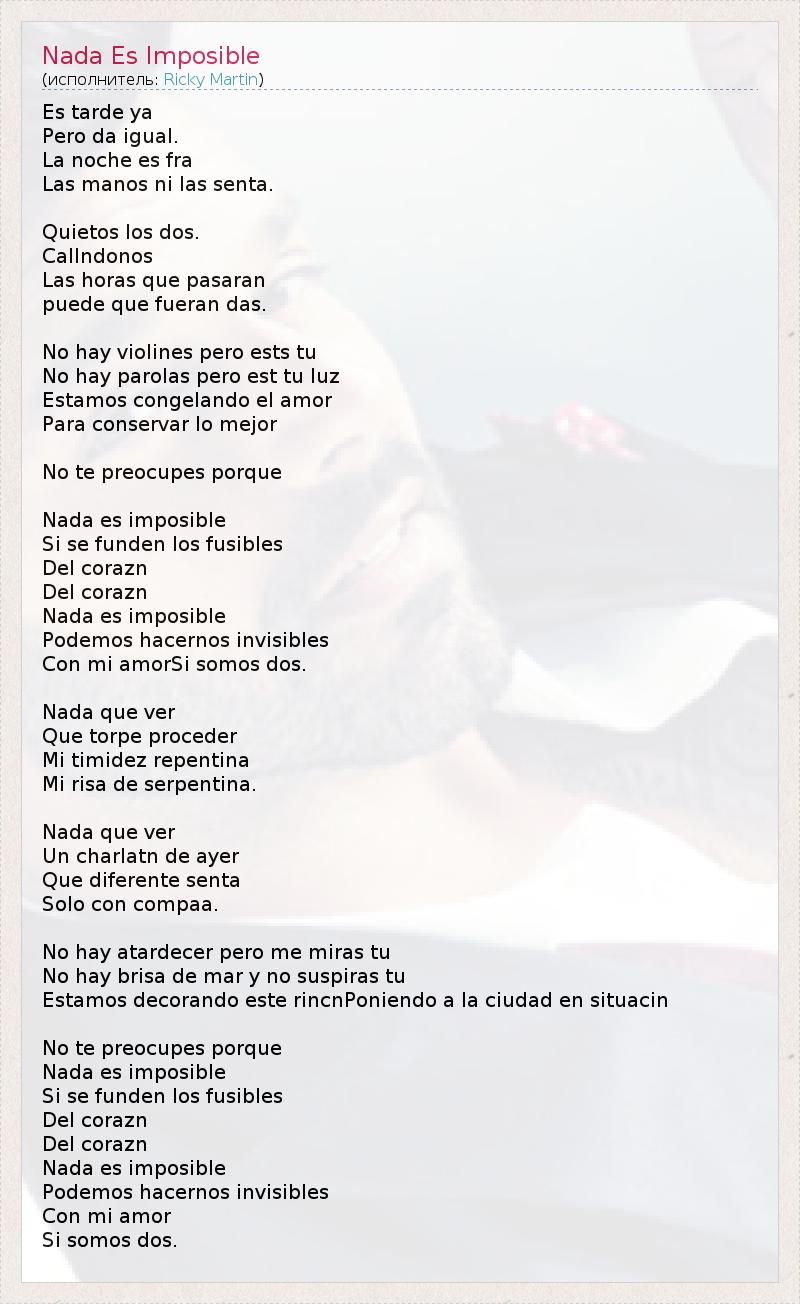 А как ты думаешь, о чем песня "Nada Es Imposible" ?