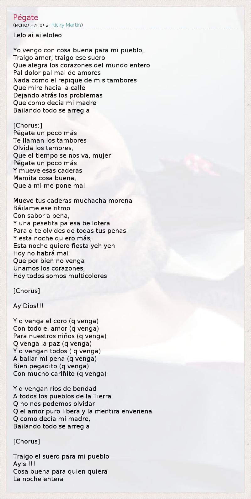 Lelolai aileloleo Yo vengo con cosa buena para mi pueblo, Traigo amor, traigo ese suero Que alegra los corazones del mundo entero Pal dolor pal mal de amores Nada como el repique de mis tambores Que mire hacia la calle Dejando atrás los problemas Que como decía mi madre Bailando todo se arregla [Chorus:] Pégate un poco más Te llaman los tambores Olvida los temores, Que el tiempo se nos va, mujer Pégate un poco más Y mueve esas caderas Mamita cosa buena, Que a mi me pone mal Mueve tus caderas muchacha morena Báilame ese ritmo Сon sabor a pena, Y una pesetita pa esa bellotera Para q te olvides de todas tus penas Y esta noche quiero más, Esta noche quiero fiesta yeh yeh Hoy no habrá mal Que por bien no venga Unamos los corazones, Hoy todos somos multicolores [Chorus] Ay Dios!!! Y q venga el coro (q venga) Con todo el amor (q venga) Para nuestros niños (q venga) Q venga la paz (q venga) Y q vengan todos ( q venga) A bailar mi pena (q venga) Bien pegadito (q venga) Con mucho cariñito (q venga) Y q vengan ríos de bondad A todos los pueblos de la Tierra Q no nos podemos olvidar Q el amor puro libera y la mentira envenena Q como decía mi madre, Bailando todo se arregla [Chorus] Traigo el suero para mi pueblo Ay si!!! Cosa buena para quien quiera La noche entera