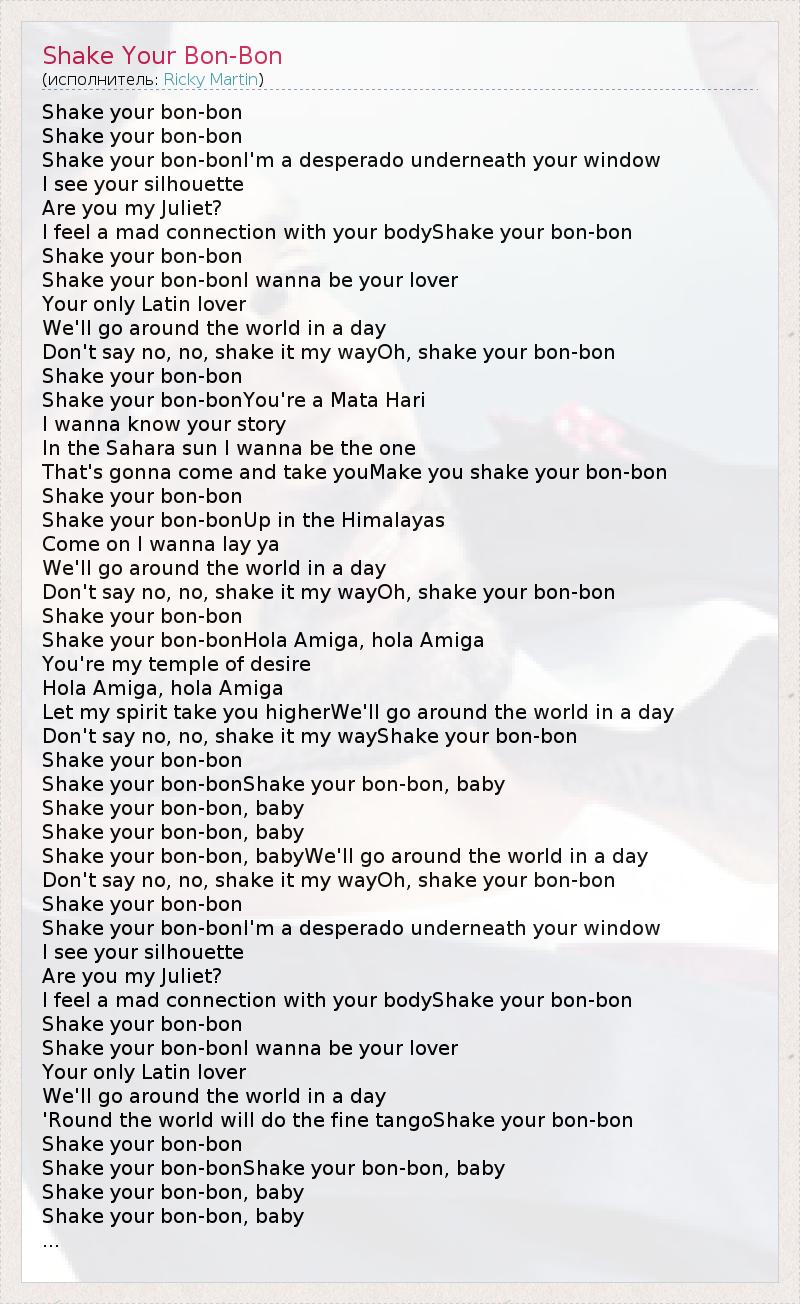 Don't say no, no, shake it my wayOh, shake your bon-bon