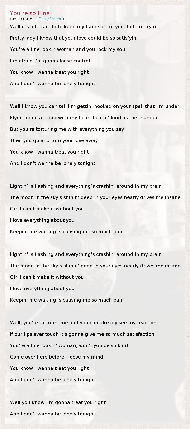 Well it's all I can do to keep my hands off of you, but I'm tryin' Pretty lady I know that your love could be so satisfyin' You're a fine lookin woman and you rock my soul I'm afraid I'm gonna loose control You know I wanna treat you right And I don't wanna be lonely tonight Well I know you can tell I'm gettin' hooked on your spell that I'm under Flyin' up on a cloud with my heart beatin' loud as the thunder But you're torturing me with everything you say Then you go and turn your love away You know I wanna treat you right And I don't wanna be lonely tonight Lightin' is flashing and everything's crashin' around in my brain The moon in the sky's shinin' deep in your eyes nearly drives me insane Girl I can't make it without you I love everything about you Keepin' me waiting is causing me so much pain Lightin' is flashing and everything's crashin' around in my brain The moon in the sky's shinin' deep in your eyes nearly drives me insane Girl I can't make it without you I love everything about you Keepin' me waiting is causing me so much pain Well, you're torturin' me and you can already see my reaction If our lips ever touch it's gonna give me so much satisfaction You're a fine lookin' woman, won't you be so kind Come over here before I loose my mind You know I wanna treat you right And I don't wanna be lonely tonight Well you know I'm gonna treat you right And I don't wanna be lonely tonight