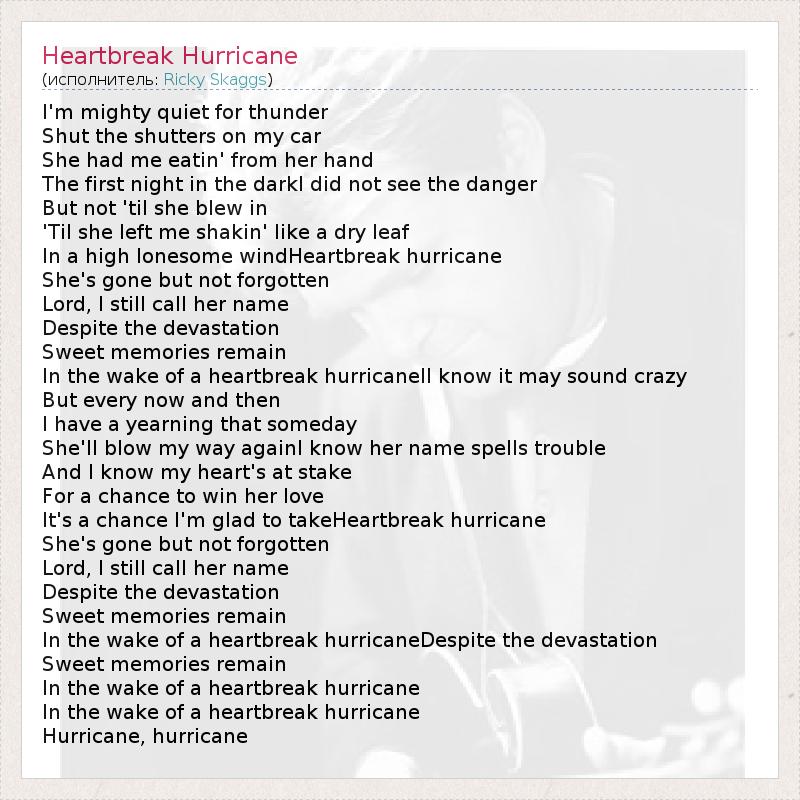 I'm mighty quiet for thunder Shut the shutters on my car She had me eatin' from her hand The first night in the darkI did not see the danger But not 'til she blew in 'Til she left me shakin' like a dry leaf In a high lonesome windHeartbreak hurricane She's gone but not forgotten Lord, I still call her name Despite the devastation Sweet memories remain In the wake of a heartbreak hurricaneII know it may sound crazy But every now and then I have a yearning that someday She'll blow my way againI know her name spells trouble And I know my heart's at stake For a chance to win her love It's a chance I'm glad to takeHeartbreak hurricane She's gone but not forgotten Lord, I still call her name Despite the devastation Sweet memories remain In the wake of a heartbreak hurricaneDespite the devastation Sweet memories remain In the wake of a heartbreak hurricane In the wake of a heartbreak hurricane Hurricane, hurricane