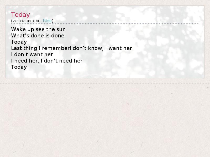 Wake up see the sun What's done is done Today Last thing I rememberI don't know, I want her I don't want her I need her, I don't need her Today
