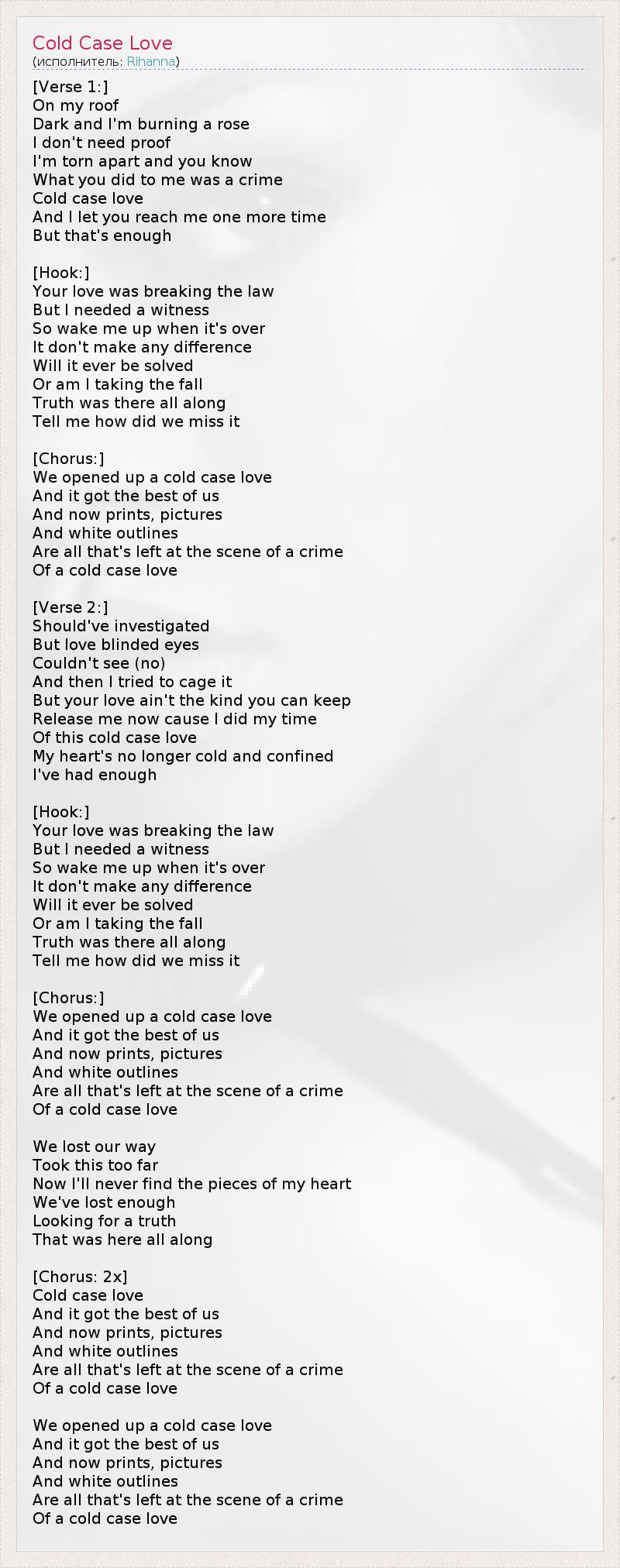 [Verse 1:] On my roof Dark and I'm burning a rose I don't need proof I'm torn apart and you know What you did to me was a crime Cold case love And I let you reach me one more time But that's enough [Hook:] Your love was breaking the law But I needed a witness So wake me up when it's over It don't make any difference Will it ever be solved Or am I taking the fall Truth was there all along Tell me how did we miss it [Chorus:] We opened up a cold case love And it got the best of us And now prints, pictures And white outlines Are all that's left at the scene of a crime Of a cold case love [Verse 2:] Should've investigated But love blinded eyes Couldn't see (no) And then I tried to cage it But your love ain't the kind you can keep Release me now cause I did my time Of this cold case love My heart's no longer cold and confined I've had enough [Hook:] Your love was breaking the law But I needed a witness So wake me up when it's over It don't make any difference Will it ever be solved Or am I taking the fall Truth was there all along Tell me how did we miss it [Chorus:] We opened up a cold case love And it got the best of us And now prints, pictures And white outlines Are all that's left at the scene of a crime Of a cold case love We lost our way Took this too far Now I'll never find the pieces of my heart We've lost enough Looking for a truth That was here all along [Chorus: 2x] Cold case love And it got the best of us And now prints, pictures And white outlines Are all that's left at the scene of a crime Of a cold case love We opened up a cold case love And it got the best of us And now prints, pictures And white outlines Are all that's left at the scene of a crime Of a cold case love
