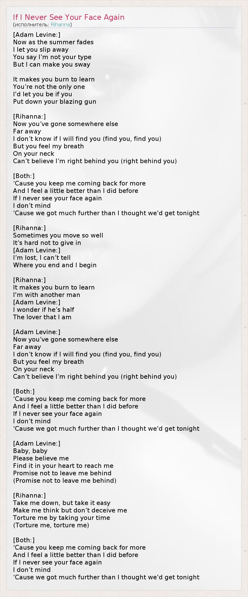 [Adam Levine:] Now as the summer fades I let you slip away You say I’m not your type But I can make you sway It makes you burn to learn You’re not the only one I'd let you be if you Put down your blazing gun [Rihanna:] Now you’ve gone somewhere else Far away I don’t know if I will find you (find you, find you) But you feel my breath On your neck Can’t believe I’m right behind you (right behind you) [Both:] ‘Cause you keep me coming back for more And I feel a little better than I did before If I never see your face again I don’t mind ‘Cause we got much further than I thought we'd get tonight [Rihanna:] Sometimes you move so well It’s hard not to give in [Adam Levine:] I’m lost, I can’t tell Where you end and I begin [Rihanna:] It makes you burn to learn I'm with another man [Adam Levine:] I wonder if he’s half The lover that I am [Adam Levine:] Now you’ve gone somewhere else Far away I don’t know if I will find you (find you, find you) But you feel my breath On your neck Can’t believe I’m right behind you (right behind you) [Both:] ‘Cause you keep me coming back for more And I feel a little better than I did before If I never see your face again I don’t mind ‘Cause we got much further than I thought we'd get tonight [Adam Levine:] Baby, baby Please believe me Find it in your heart to reach me Promise not to leave me behind (Promise not to leave me behind) [Rihanna:] Take me down, but take it easy Make me think but don’t deceive me Torture me by taking your time (Torture me, torture me) [Both:] ‘Cause you keep me coming back for more And I feel a little better than I did before If I never see your face again I don’t mind ‘Cause we got much further than I thought we'd get tonight