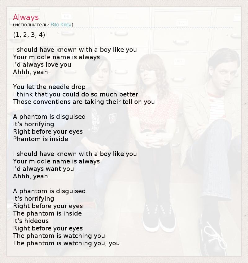 (1, 2, 3, 4) I should have known with a boy like you Your middle name is always I'd always love you Ahhh, yeah You let the needle drop I think that you could do so much better Those conventions are taking their toll on you A phantom is disguised It's horrifying Right before your eyes Phantom is inside I should have known with a boy like you Your middle name is always I'd always want you Ahhh, yeah A phantom is disguised It's horrifying Right before your eyes The phantom is inside It's hideous Right before your eyes The phantom is watching you The phantom is watching you, you